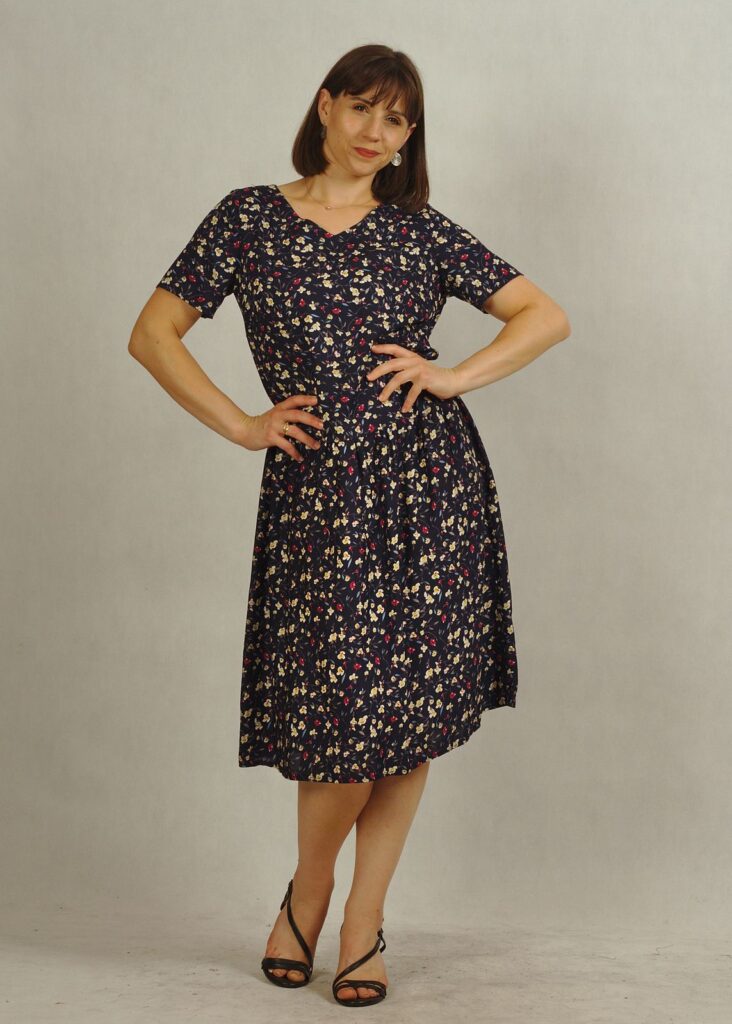 Sukienka granatowa*w drobne kwiatuszki z pięknym dekoltem w serek, która podkreśla kobiecą sylwetkę doda Ci elegancji.