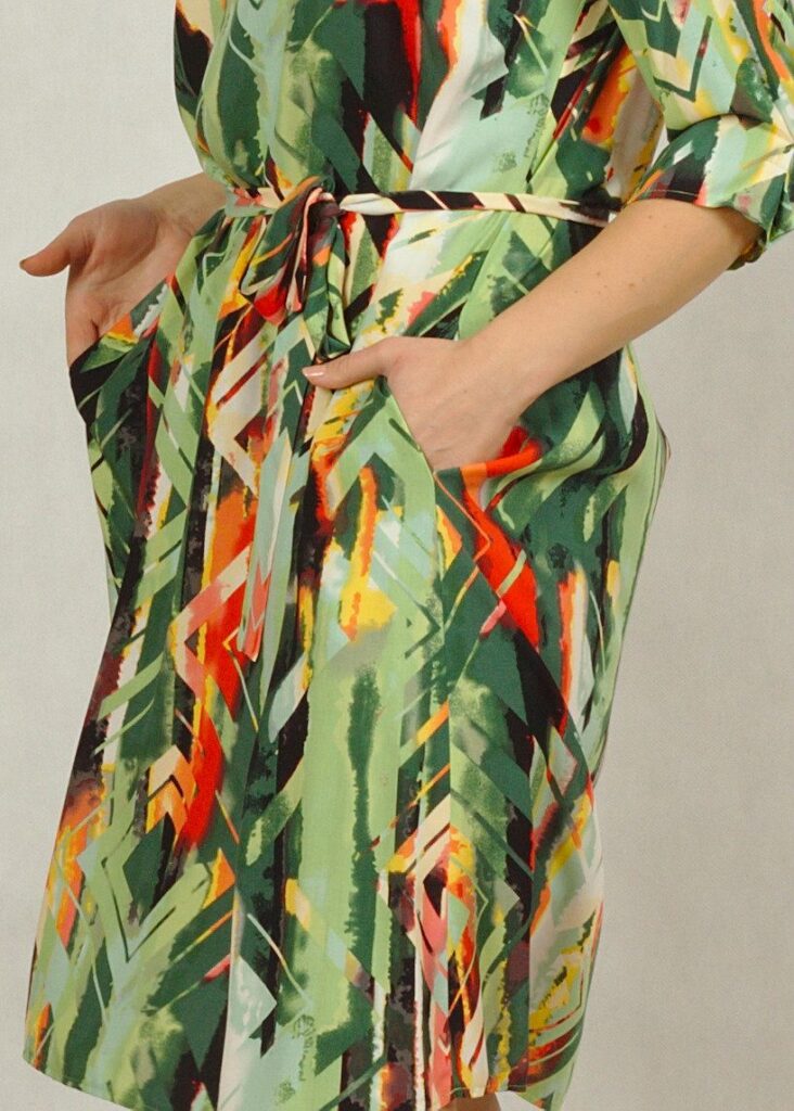 Sukienka ma długość za kolano i posiada wielofunkcyjne kieszenie.