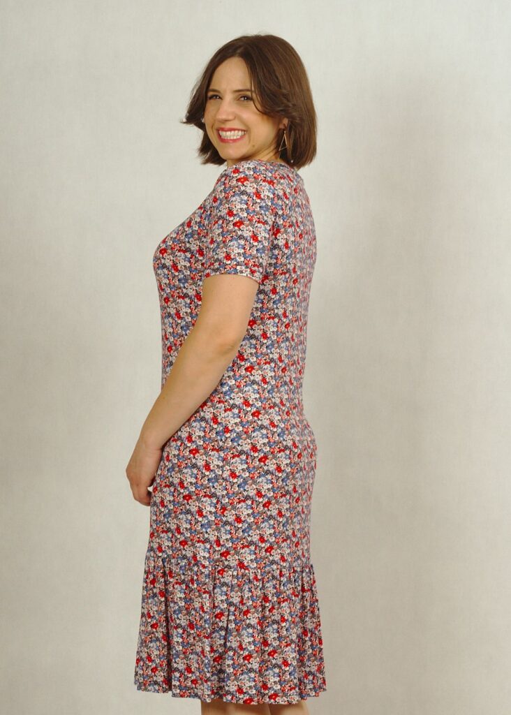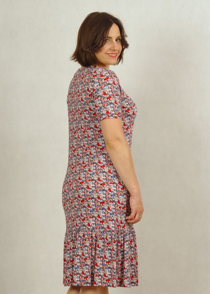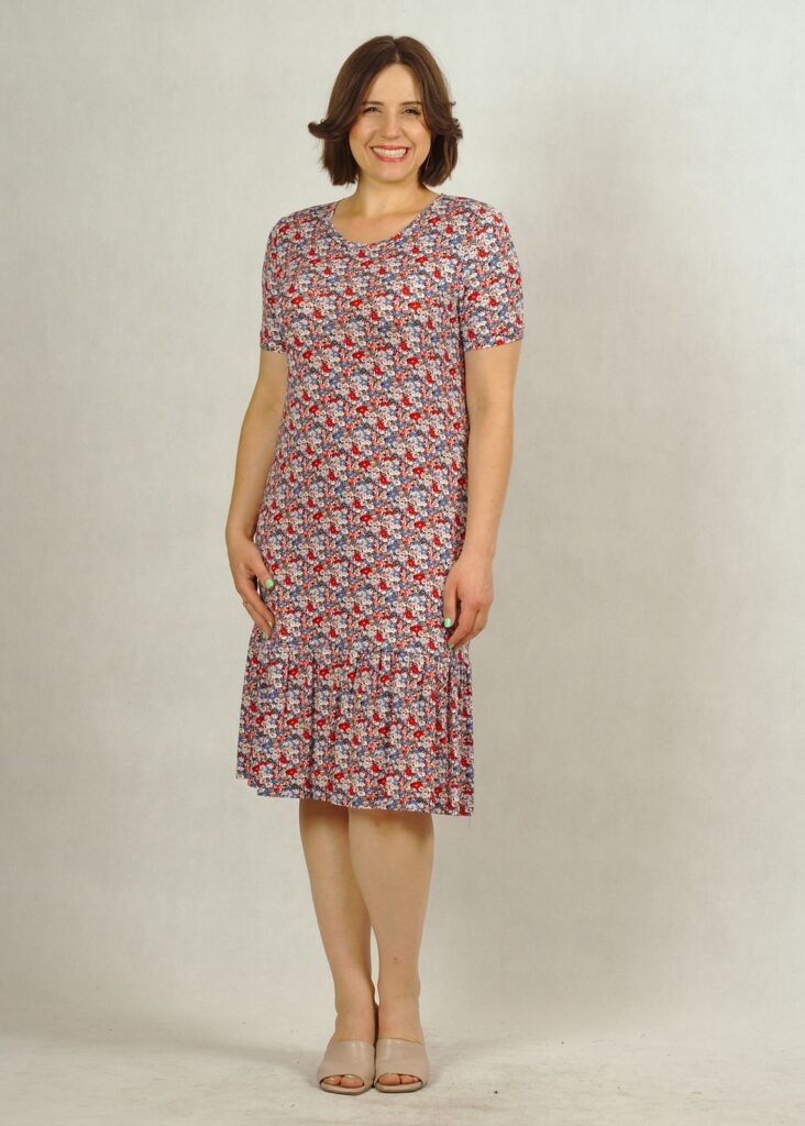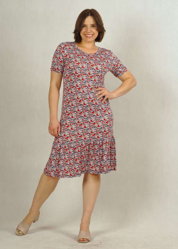Długość całkowita sukienki dla rozmiaru M – 100cm; dla rozmiaru 4XL – 106cm. Długość falbanki – 25cm.