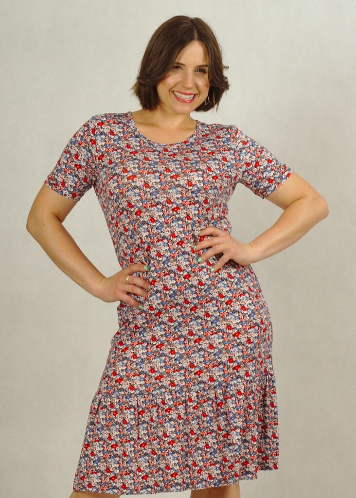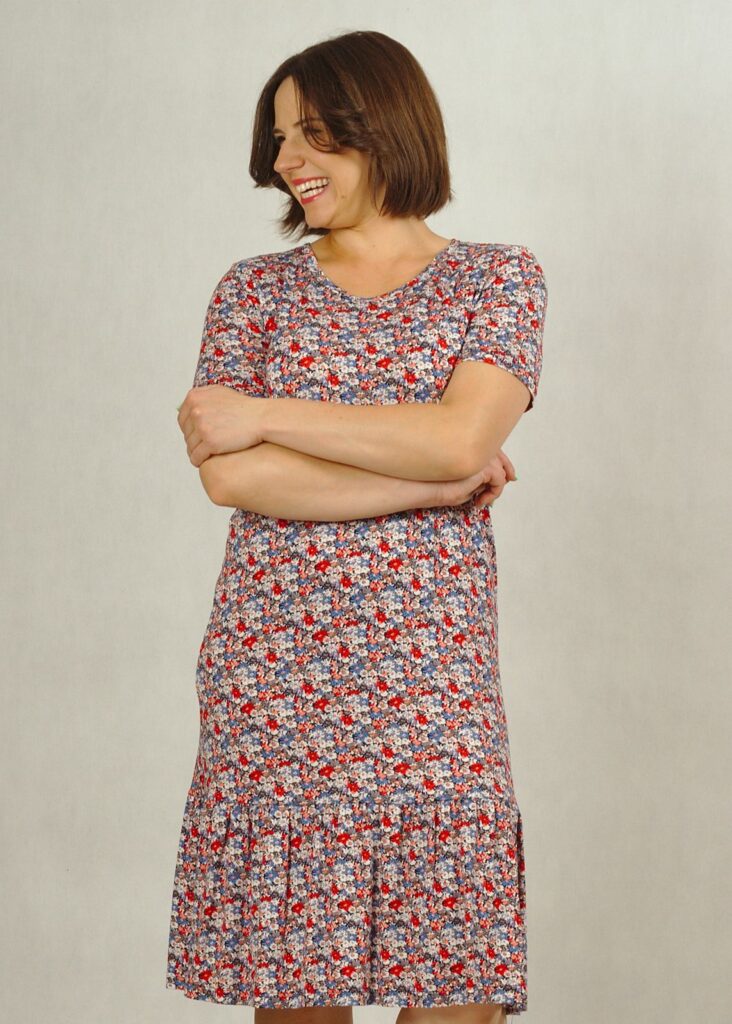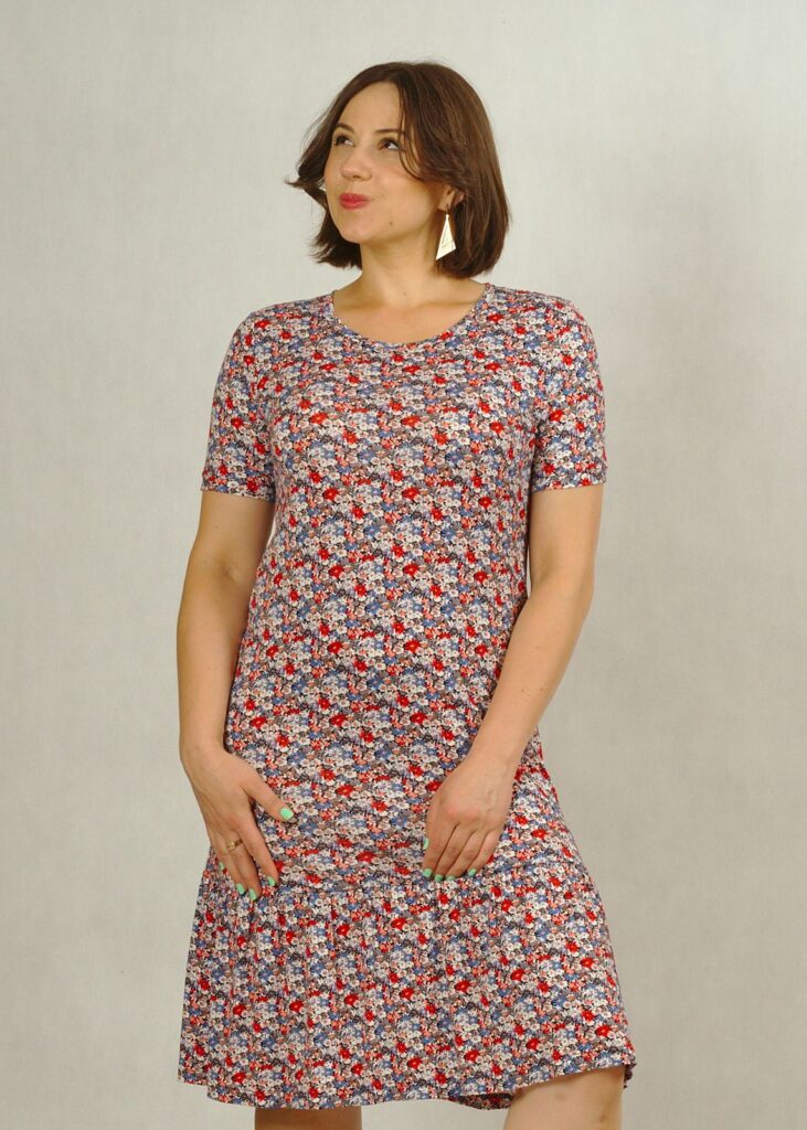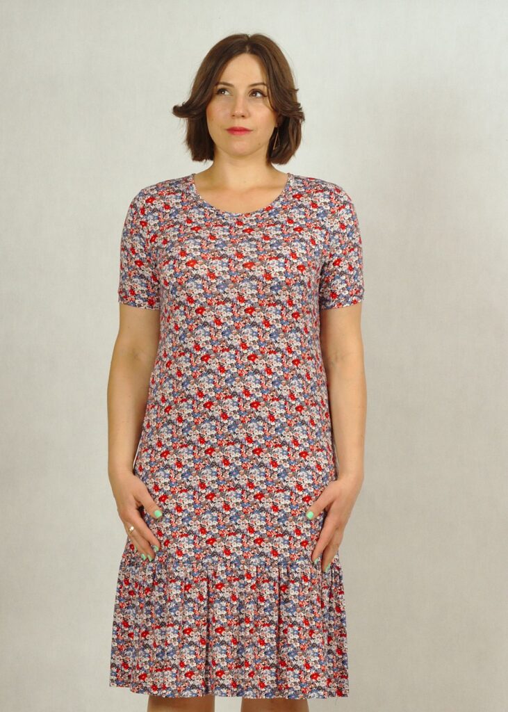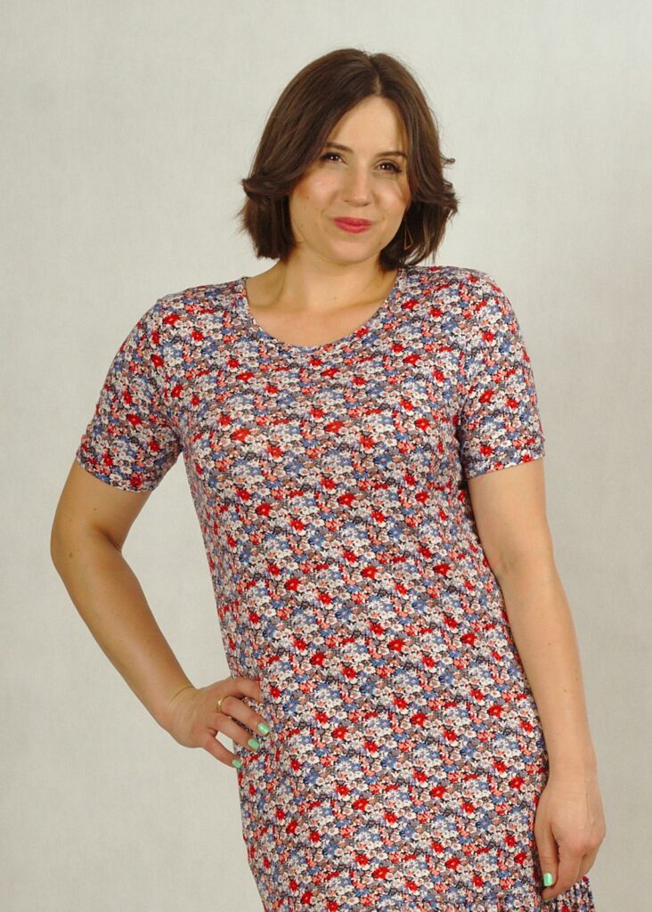 Uszyta z dzianiny wiskozowej, zakończona u dołu bardzo subtelną falbanką, która dodaje sukience uroku.