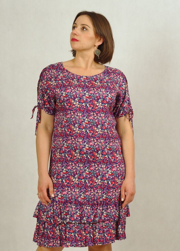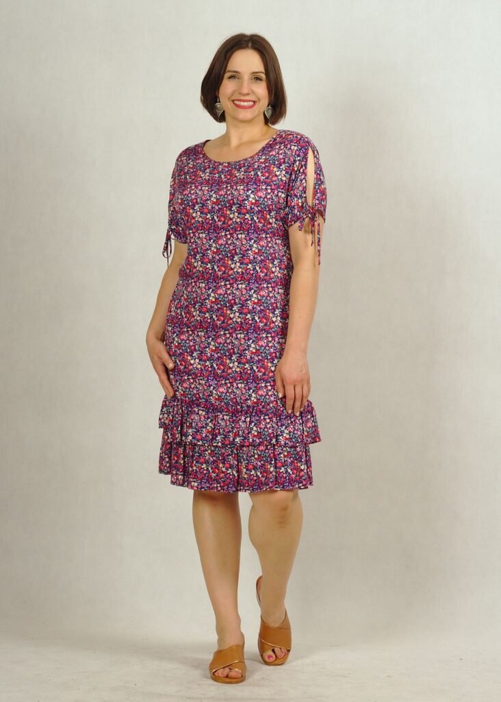 Sukienka w fioletowe kwiatki z falbanką i rozcięciem na ramieniu /626/