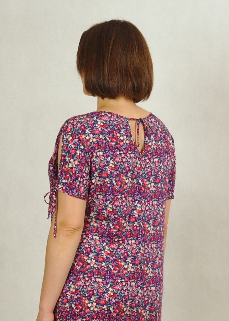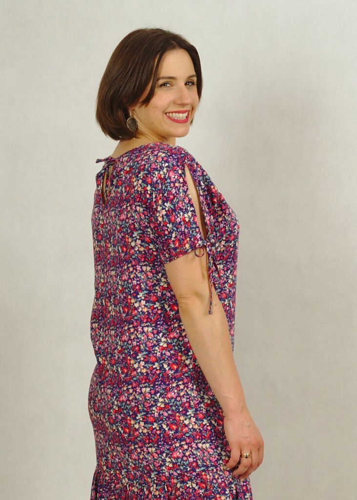 Sukienka posiada oryginalne wiązania przy rękawach. Możesz regulować siłę wiązania. Bardzo subtelnie odkryje Twoje ramiona!