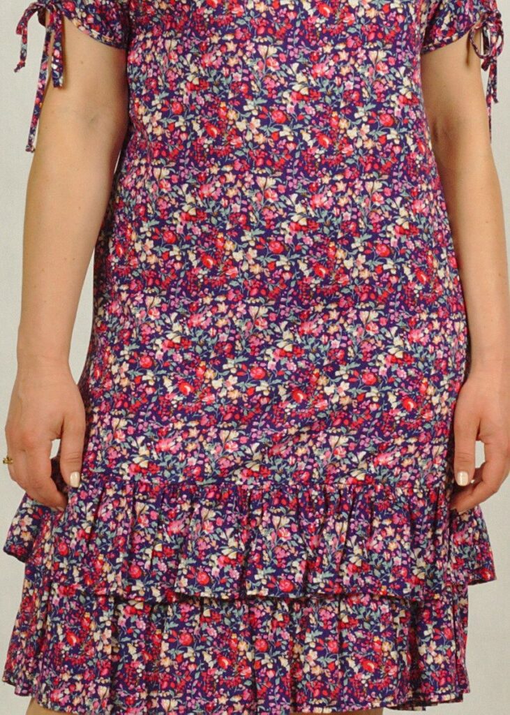 Sukienka ma podwójną falbankę u dołu. Dzięki niej Twoja sylwetka wyglądać będzie świetnie!
