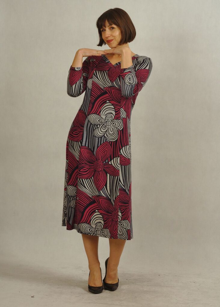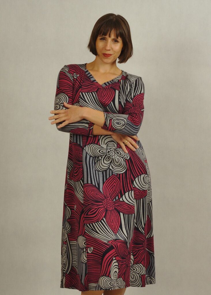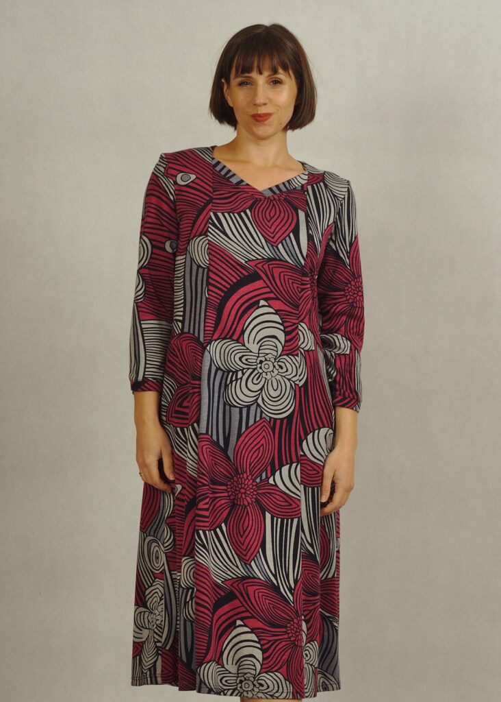 Materiał, z którego uszyta została suknia zawiera sporą dawkę wiskozy, dzięki czemu jest bardzo przyjemny w dotyku i użytkowaniu.