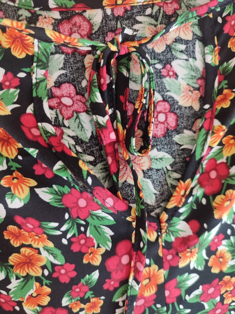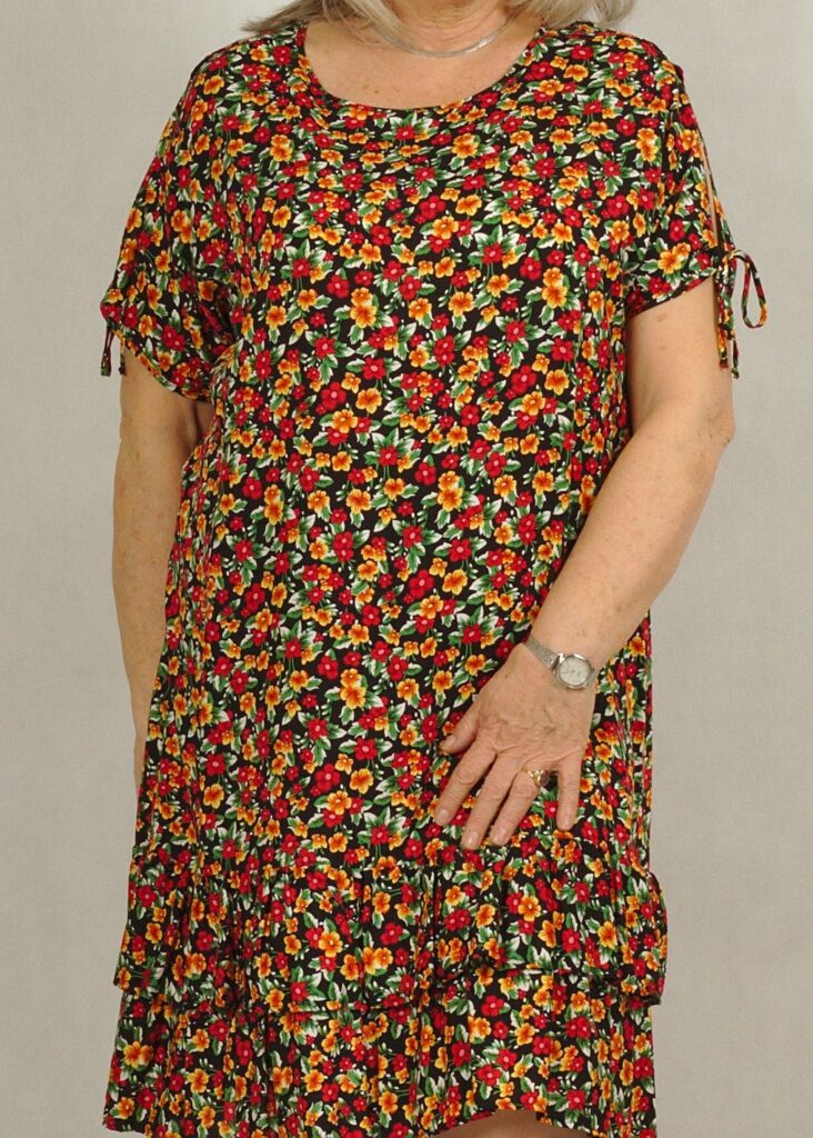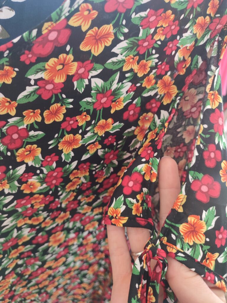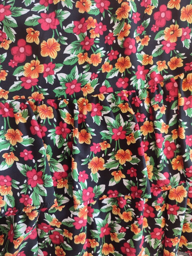 Sukienka z falbanką u dołu doda Ci kobiecości, a rozcięcia na rękawach subtelnie odkryją Twoje ręce. Letnia sukienka w kwiatki ma śliczne kolory – pomarańczowe i czerwone kwiatki na czarnym tle*