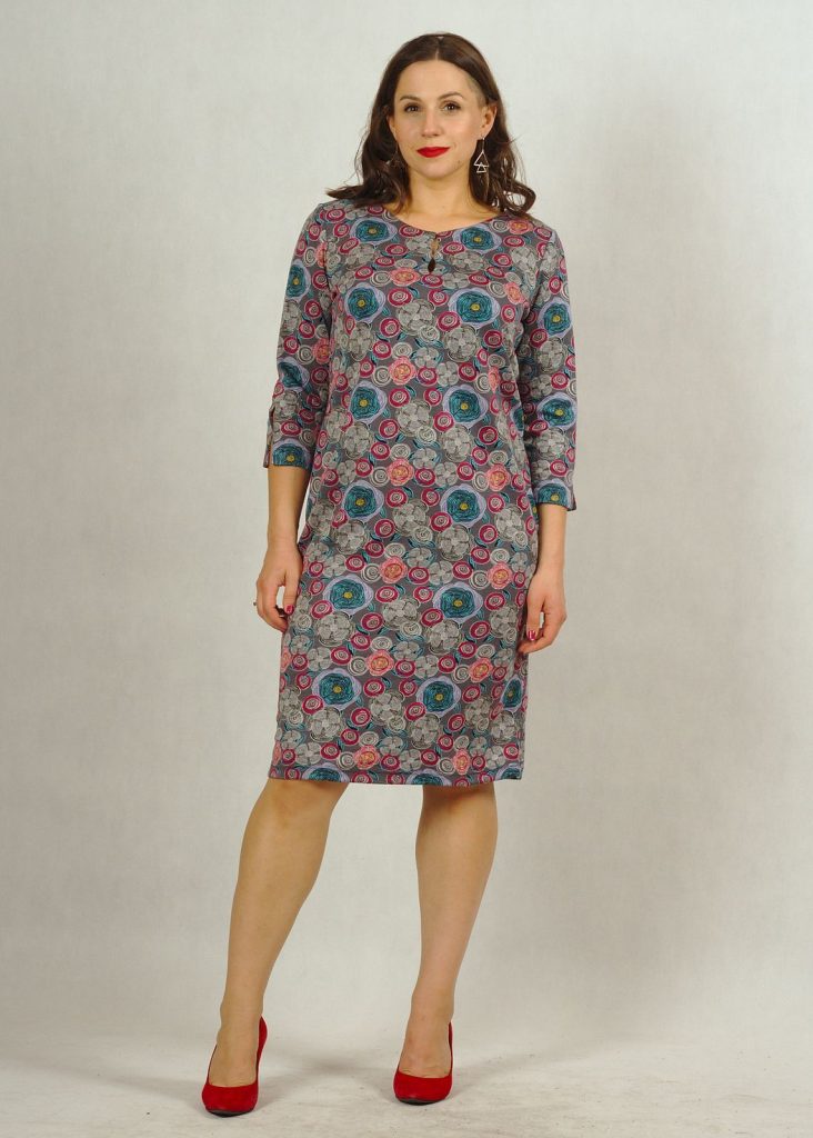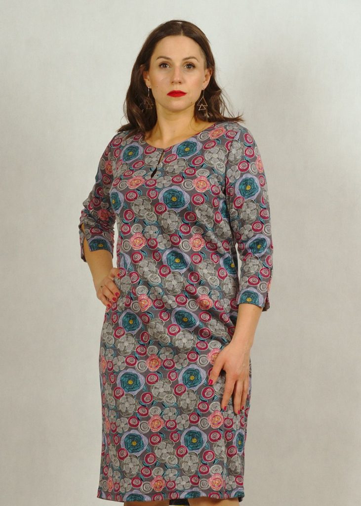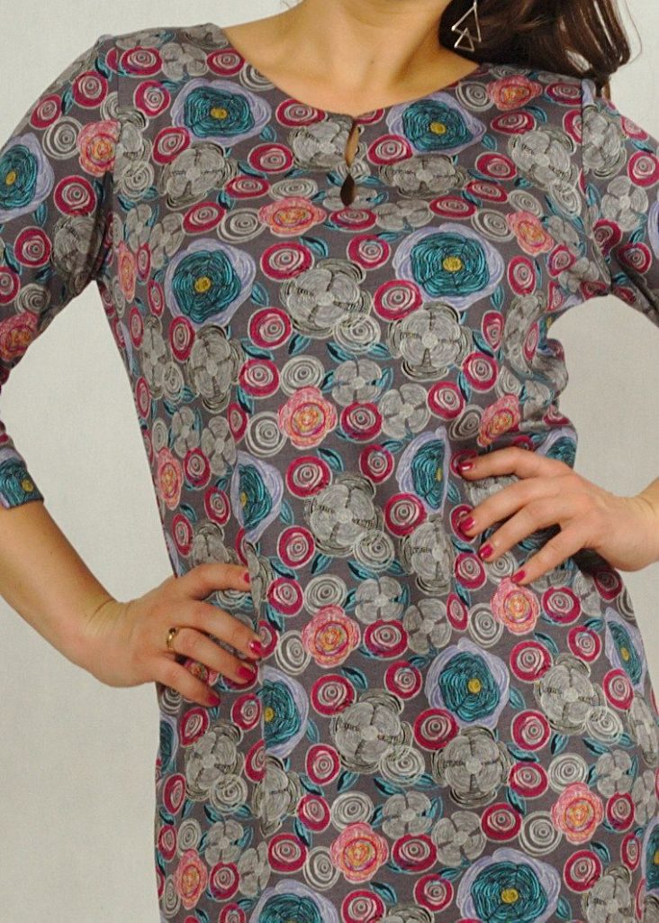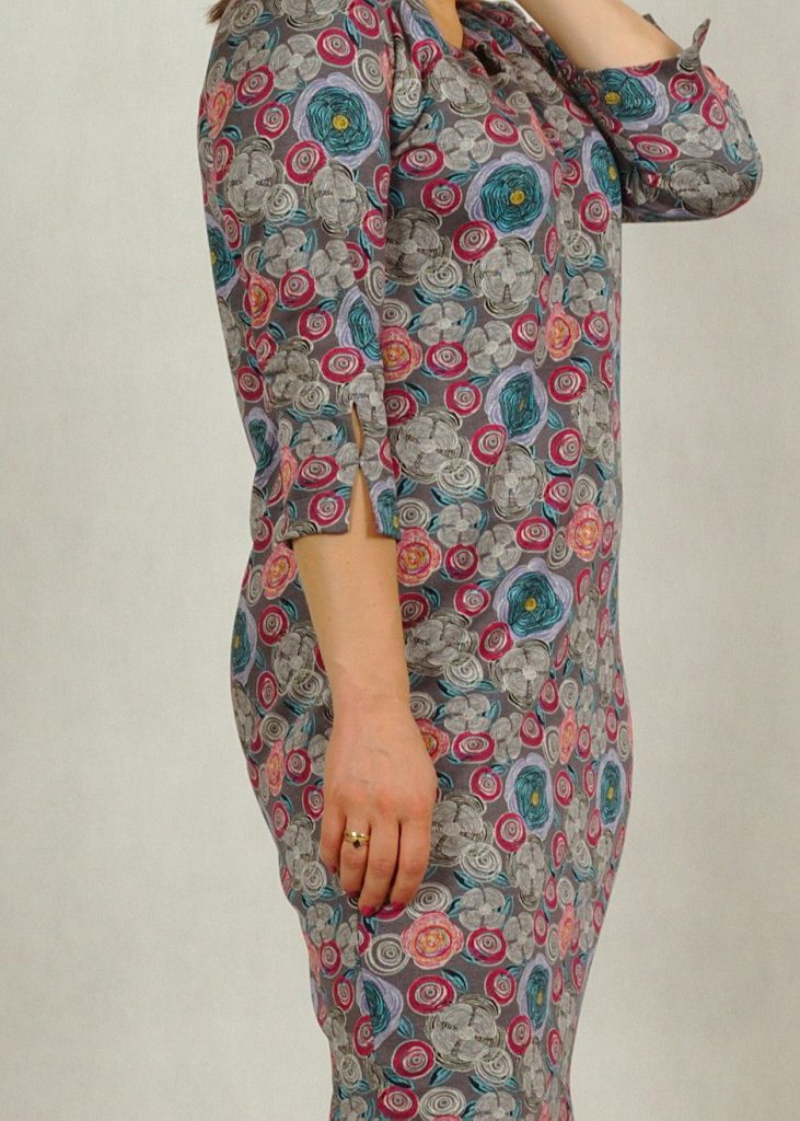 Fason sukienki jest prosty, a rękaw ma długość 3/4 i również delikatne rozcięcia.