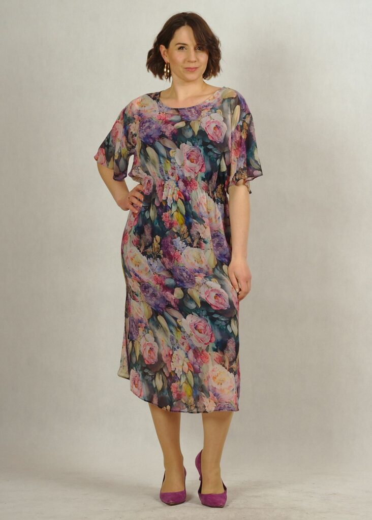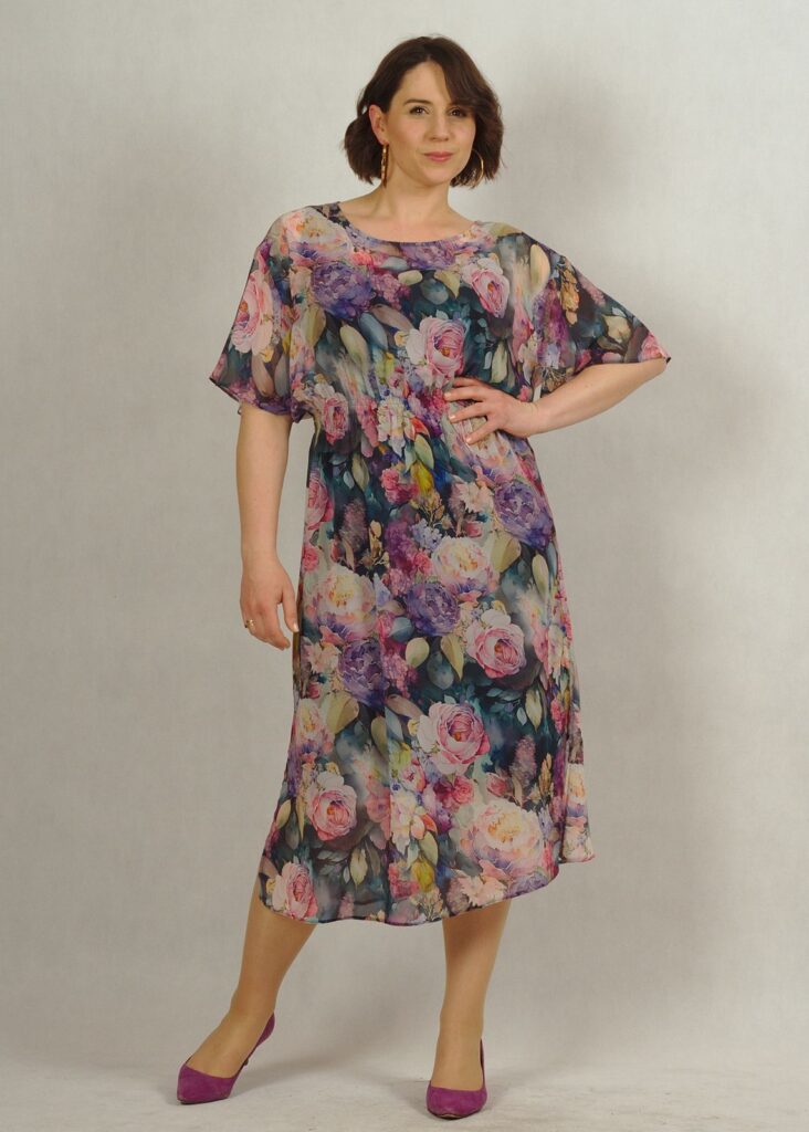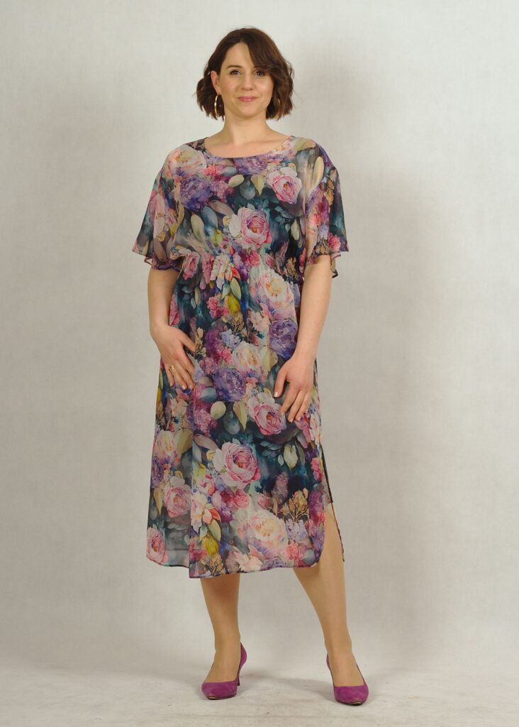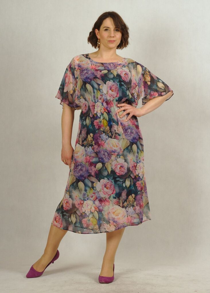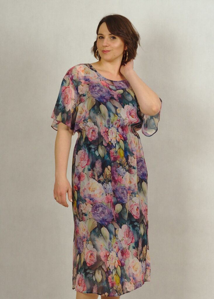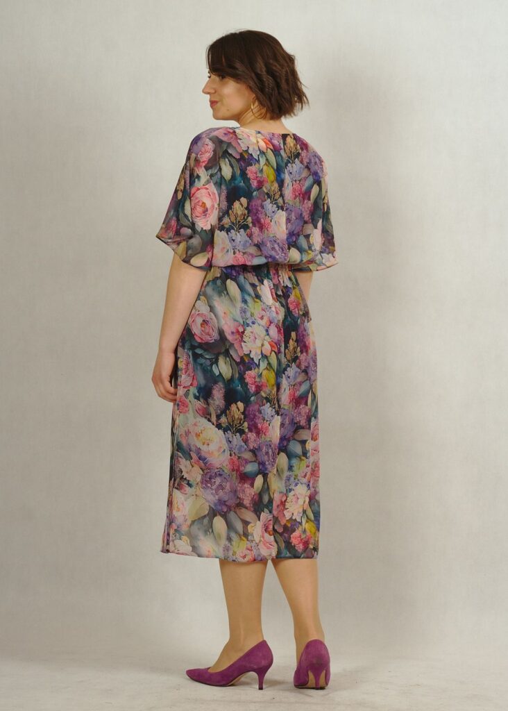 Elegancka sukienka uszyta z szyfonu w piękny kwiatowy wzór w odcieniach fioletu*.