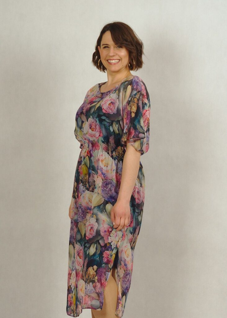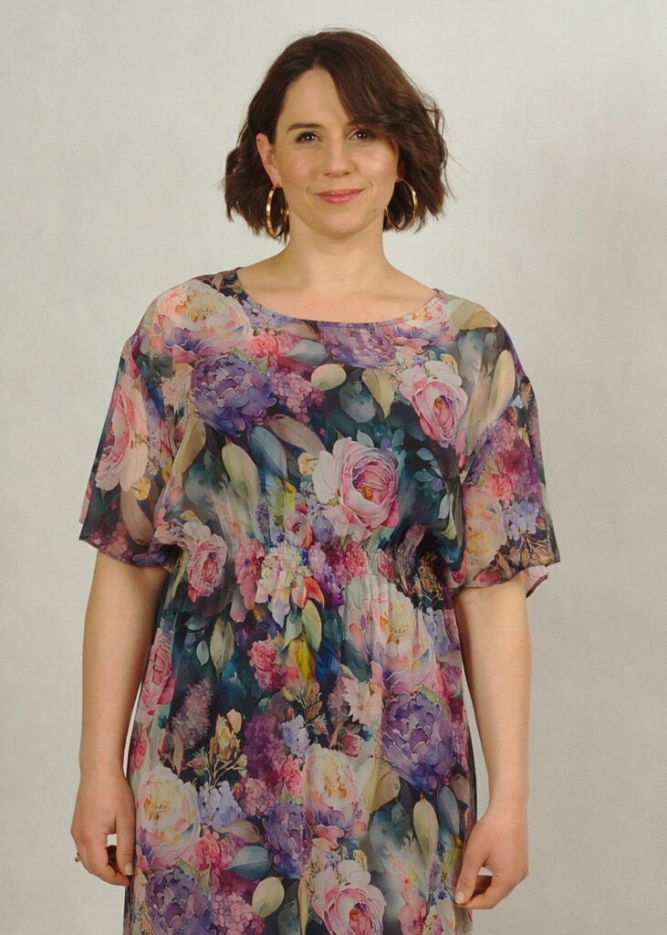 Dzięki wszytej gumce w talii, sukienka wspaniale się układa i podkreśla figurę lub ukrywa niedoskonałości.