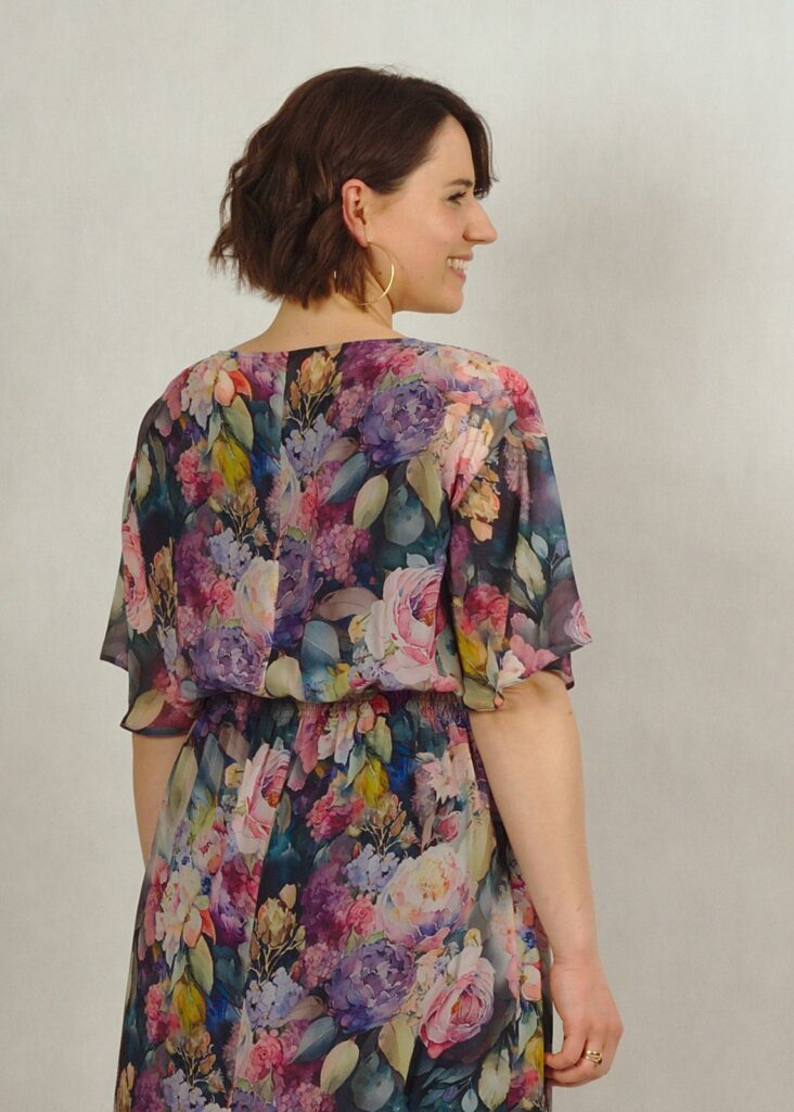 Rękawek sukienki to typ “motylka”, pięknie opadający na ramiona, a jednocześnie delikatnie falujący.