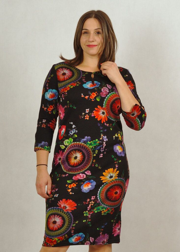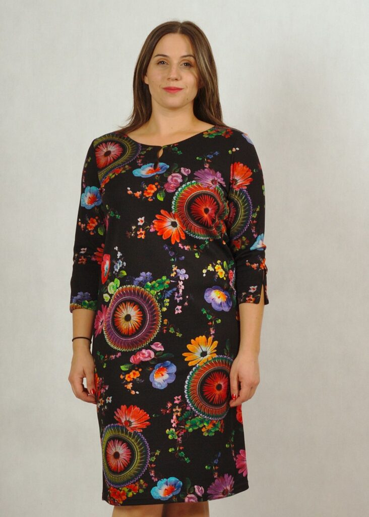 Fason sukienki jest prosty, a rękaw ma długość 3/4 i również delikatne rozcięcia.