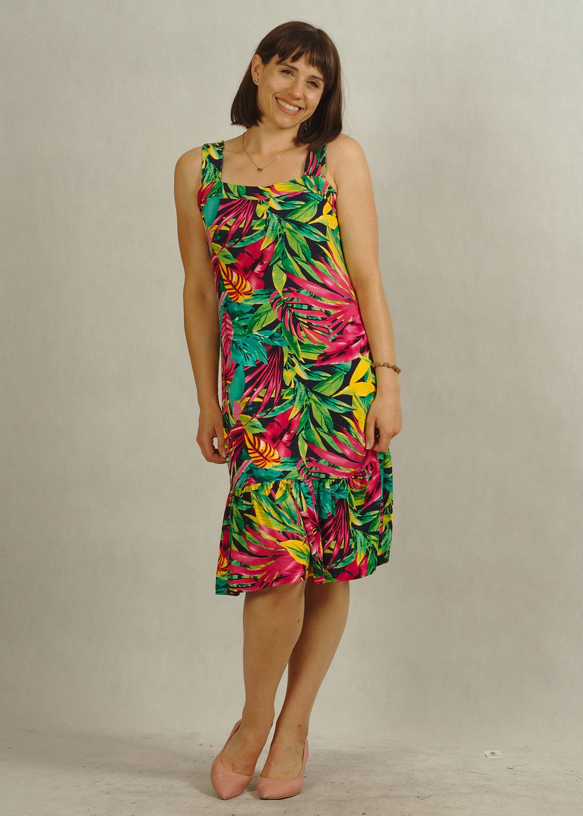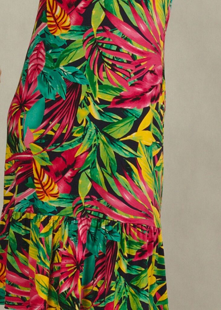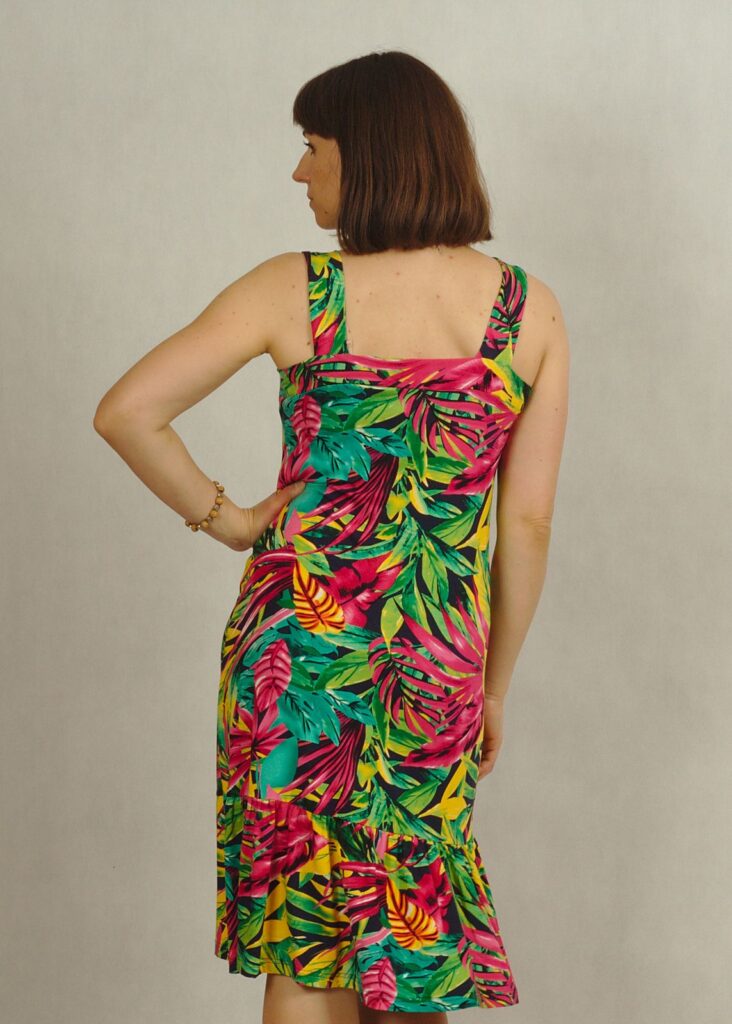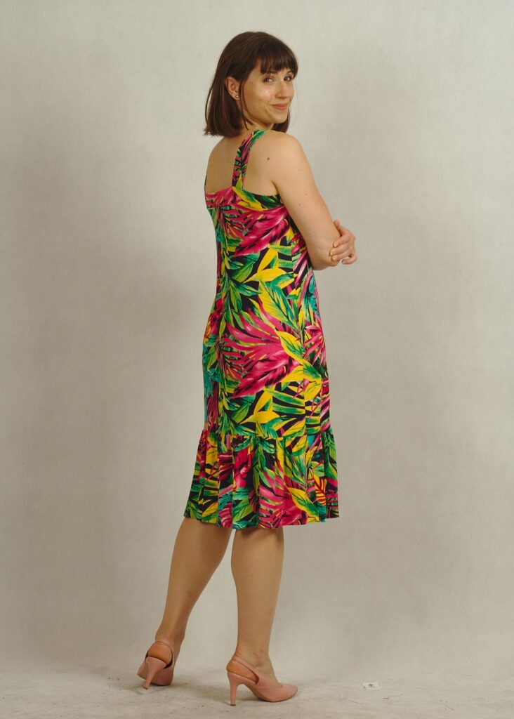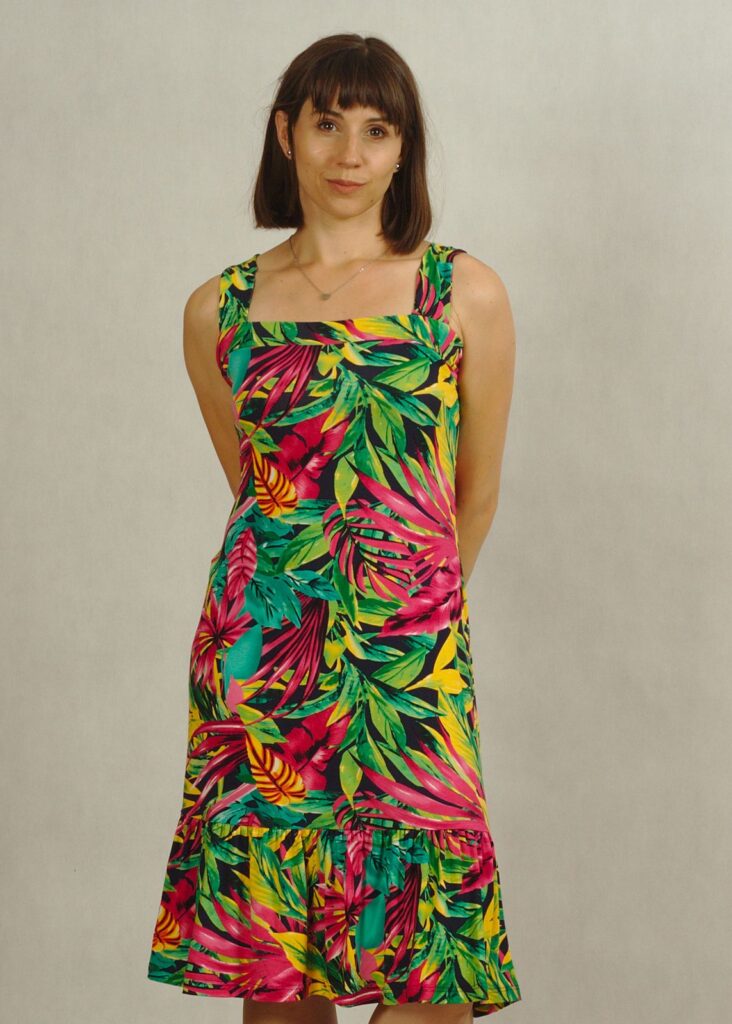 Subtelna falbanka dodaje lekkości, a modne wzory – różowe i zielone – sprawiają, że sukienka wyróżnia się wśród letniej odzieży damskiej.