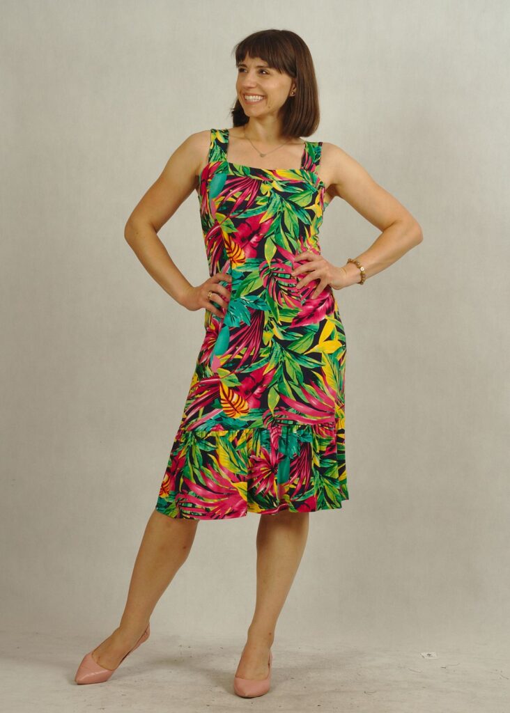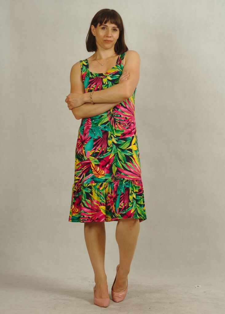 Nasza sukienka na ramiączkach łączy wygodę i styl – wykonana z miękkiej dzianiny wiskozowej, gwarantuje komfort noszenia nawet podczas upałów. Model do kolan pięknie układa się na sylwetce, podkreślając kobiece kształty.