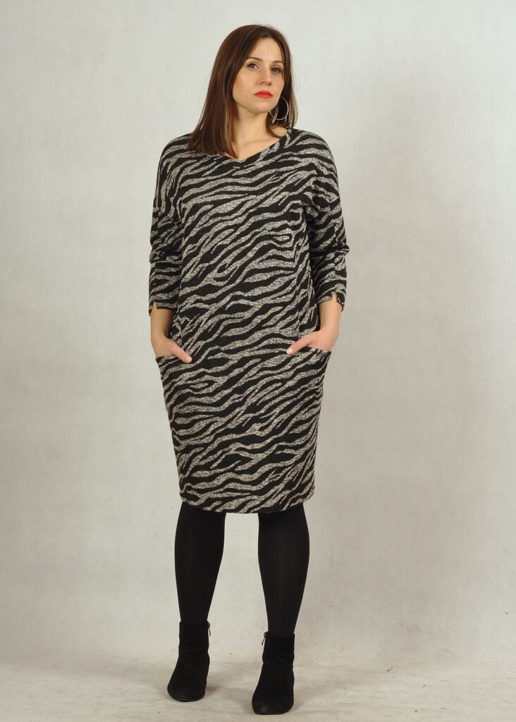 Ma modny wzór w zebrę. Czarne pasy na szarym tle*.