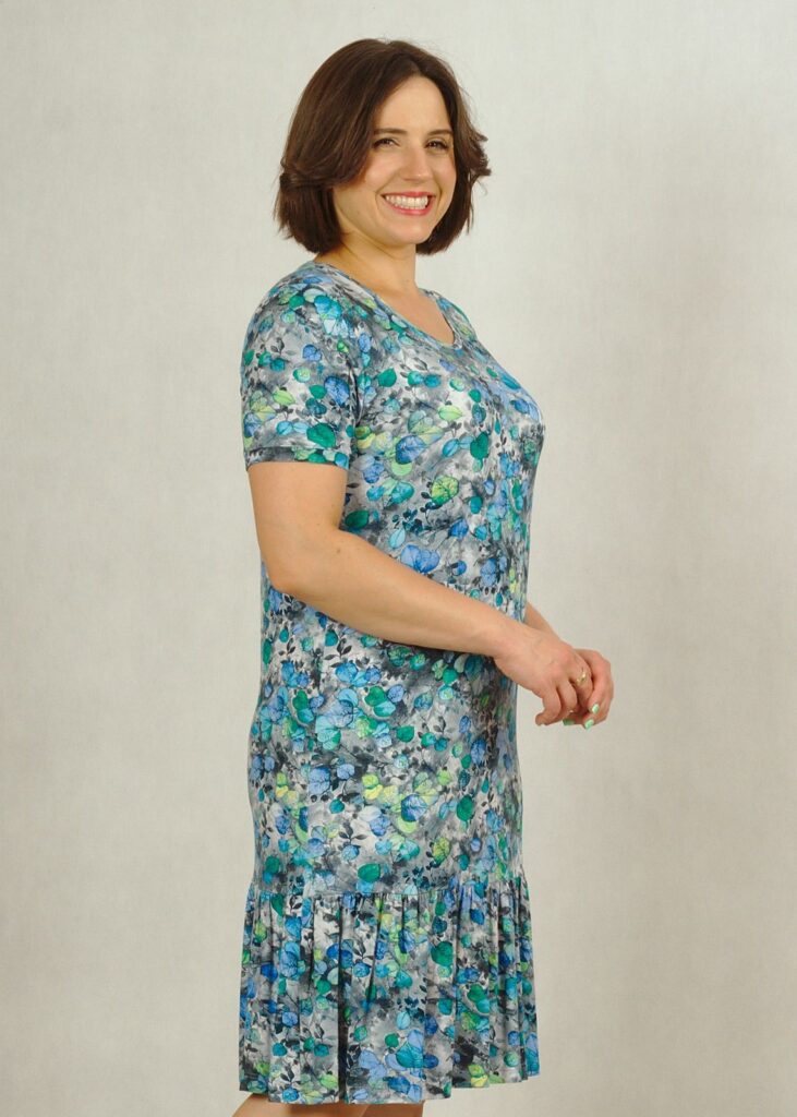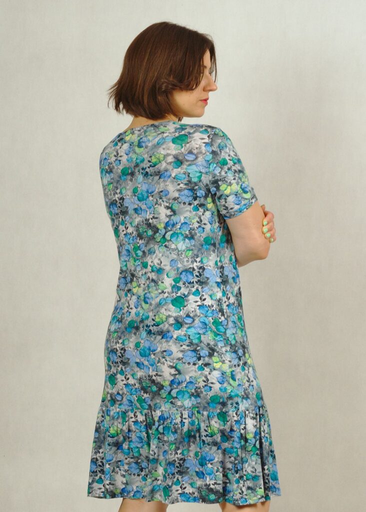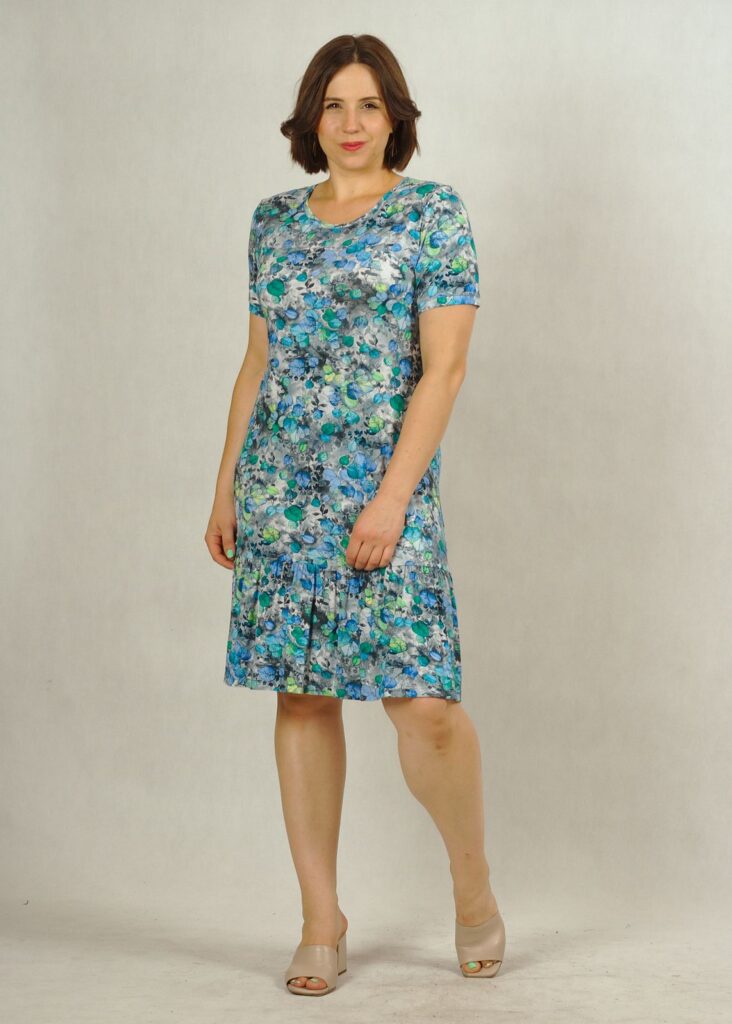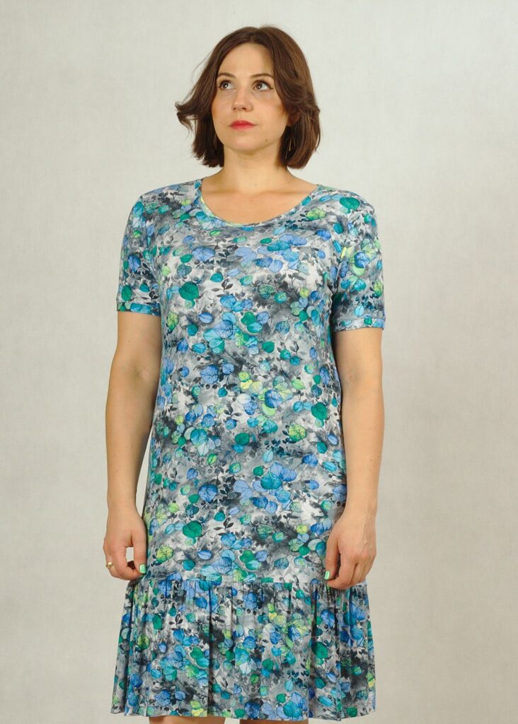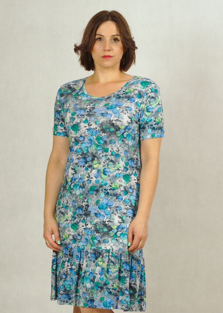 Sukienka wykonana z dzianiny wiskozowej, zakończona u dołu delikatną falbanką, która dodaje kobiecości.
