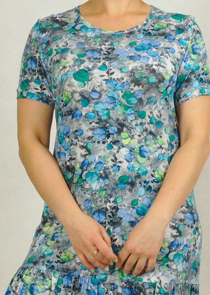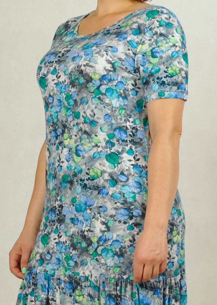 Sukienka ma półokrągły dekolt i krótki, wszywany rękaw.