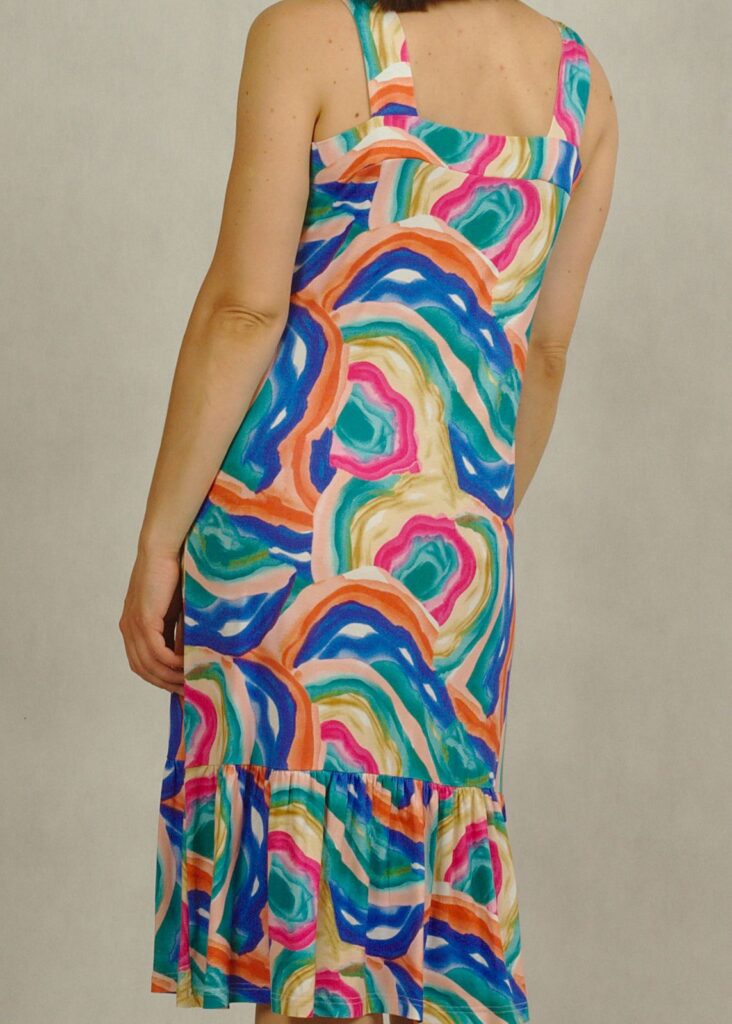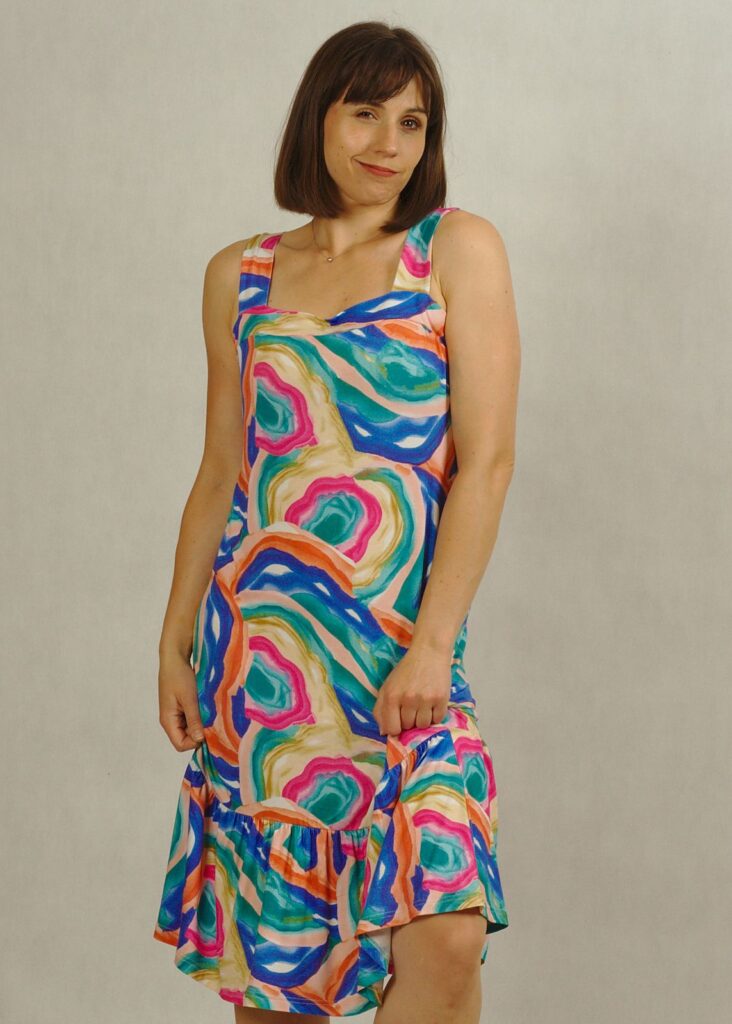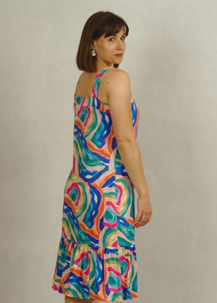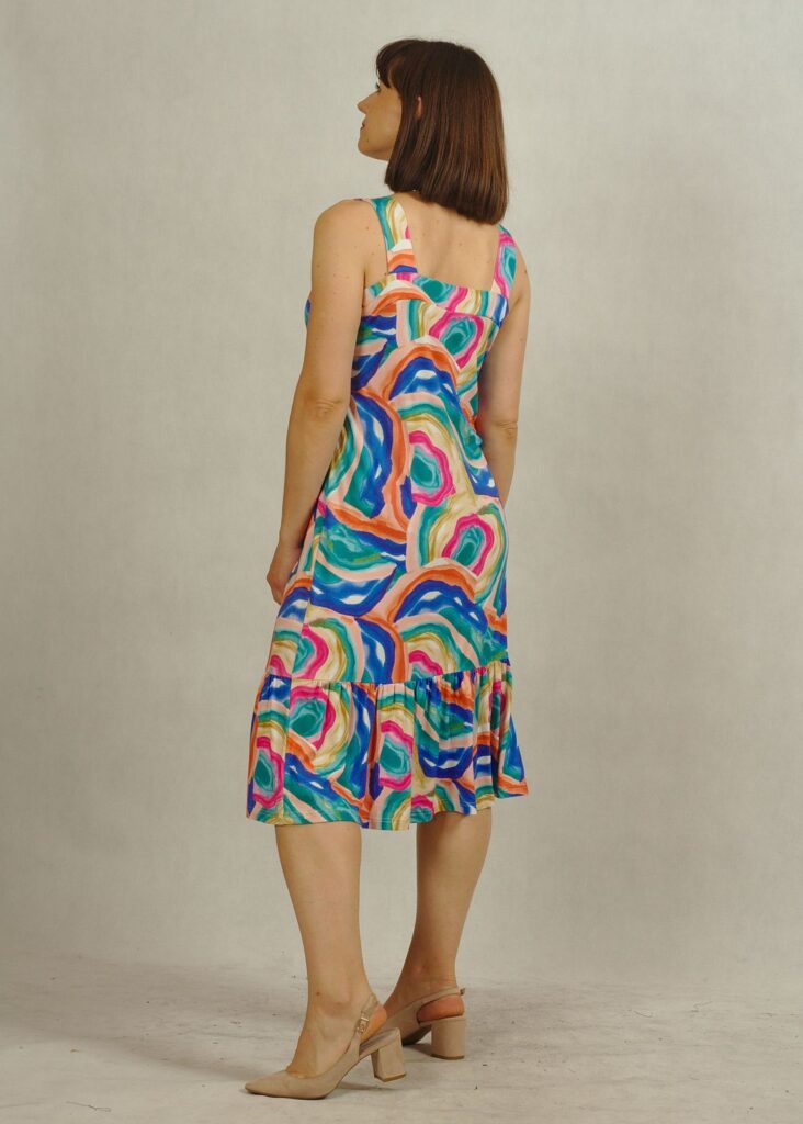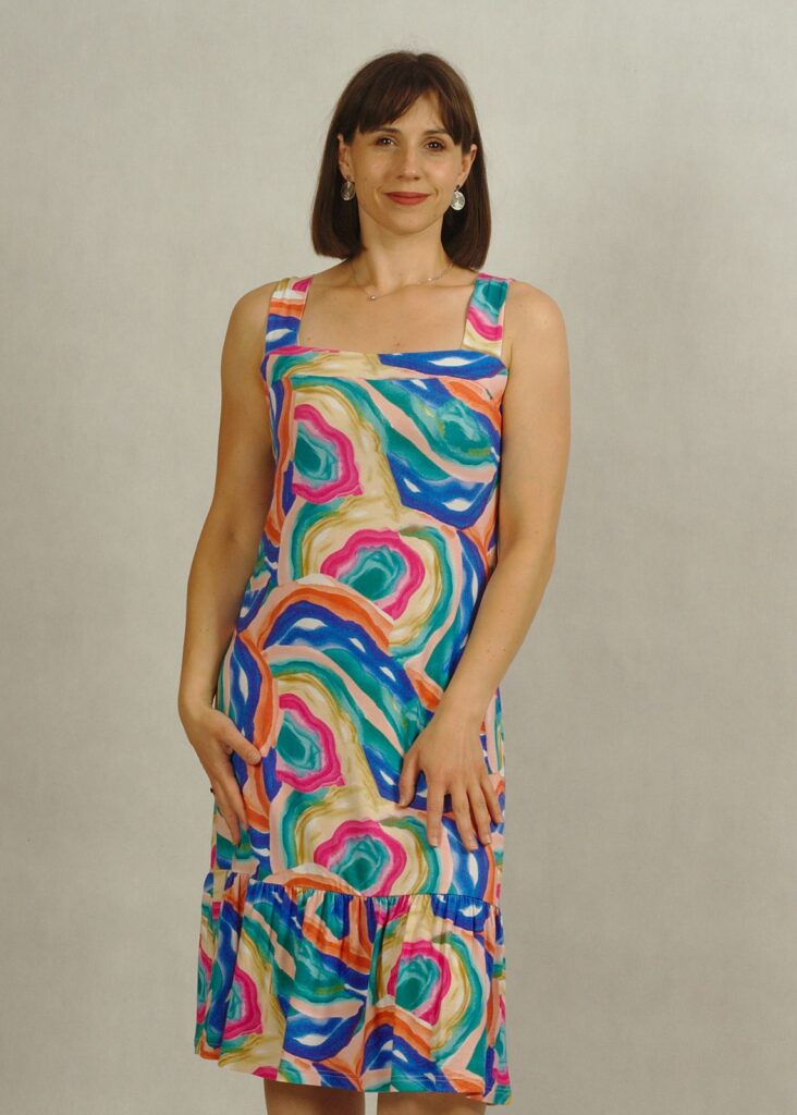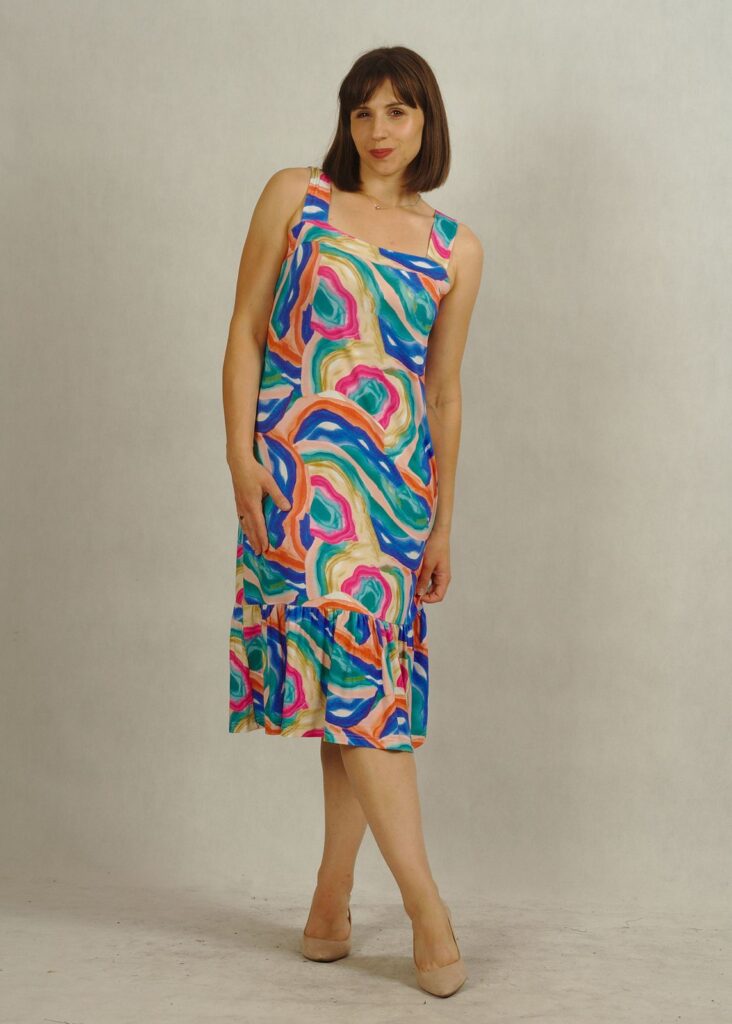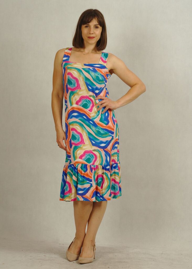 Nasza sukienka na szerokich ramiączkach łączy swobodę z kobiecym stylem.