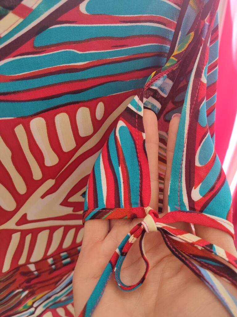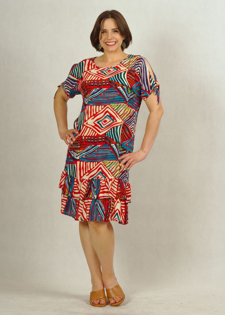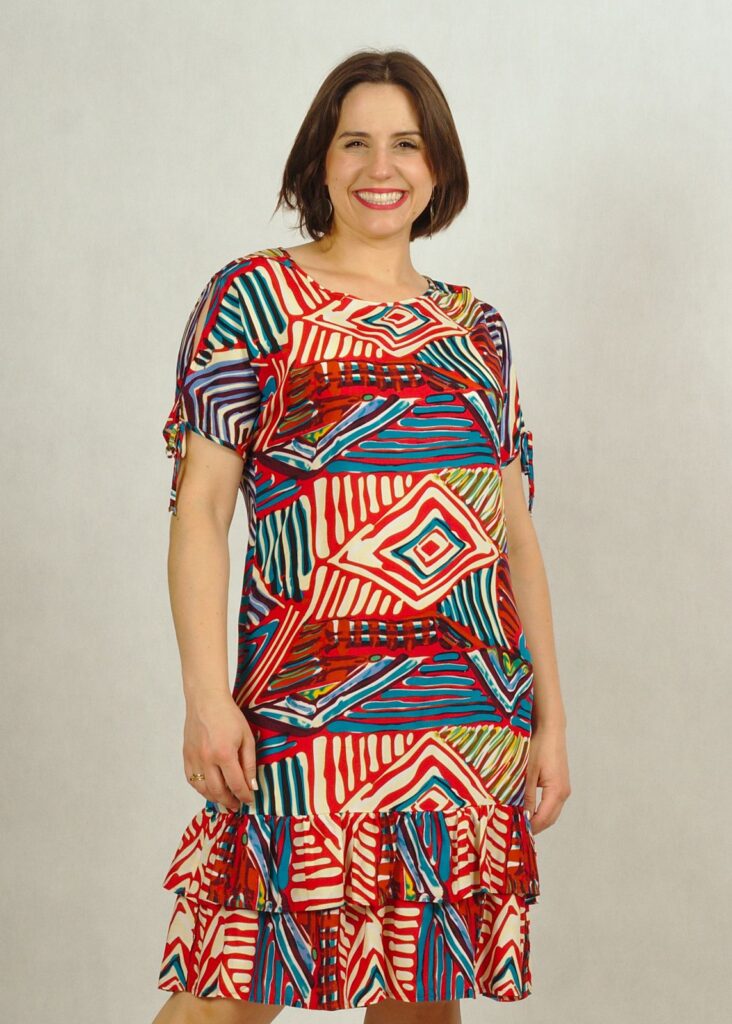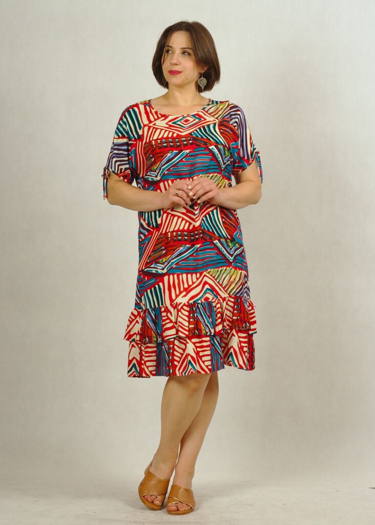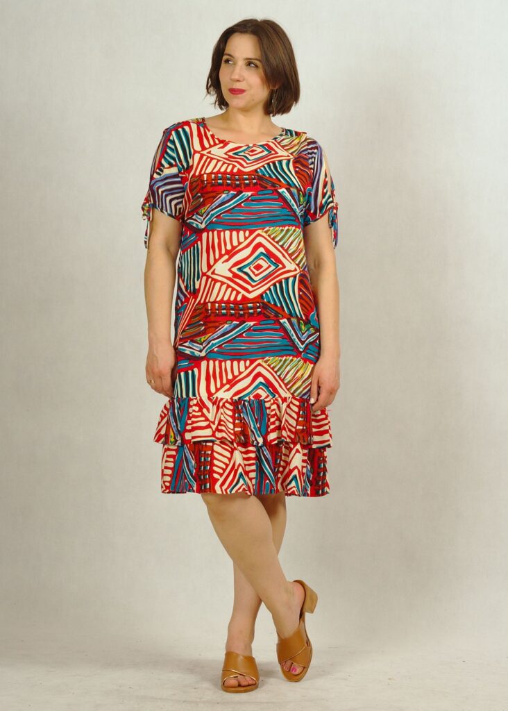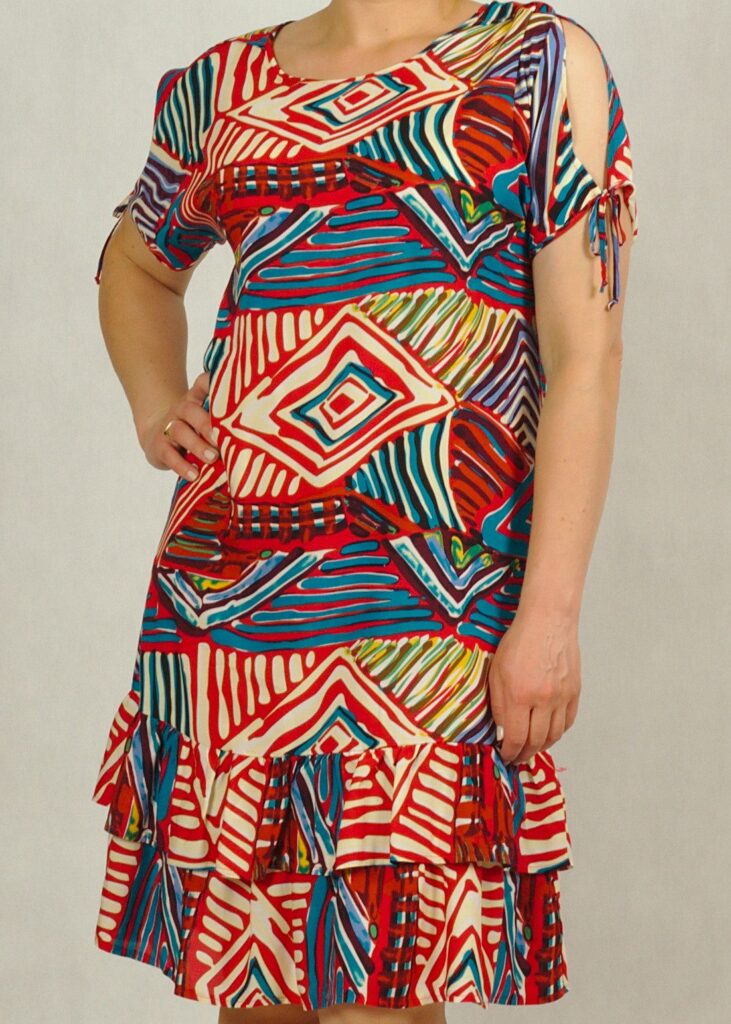 Sukienka ma wiele kolorów, geometryczne wzory.