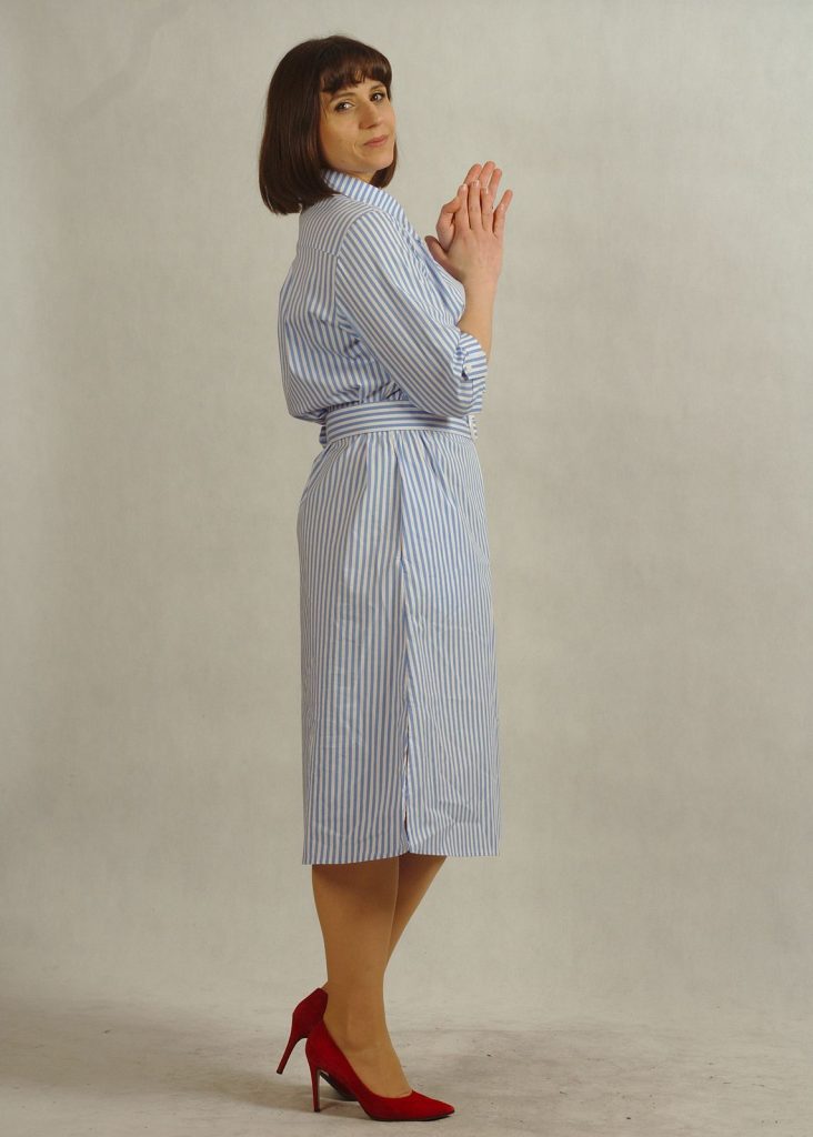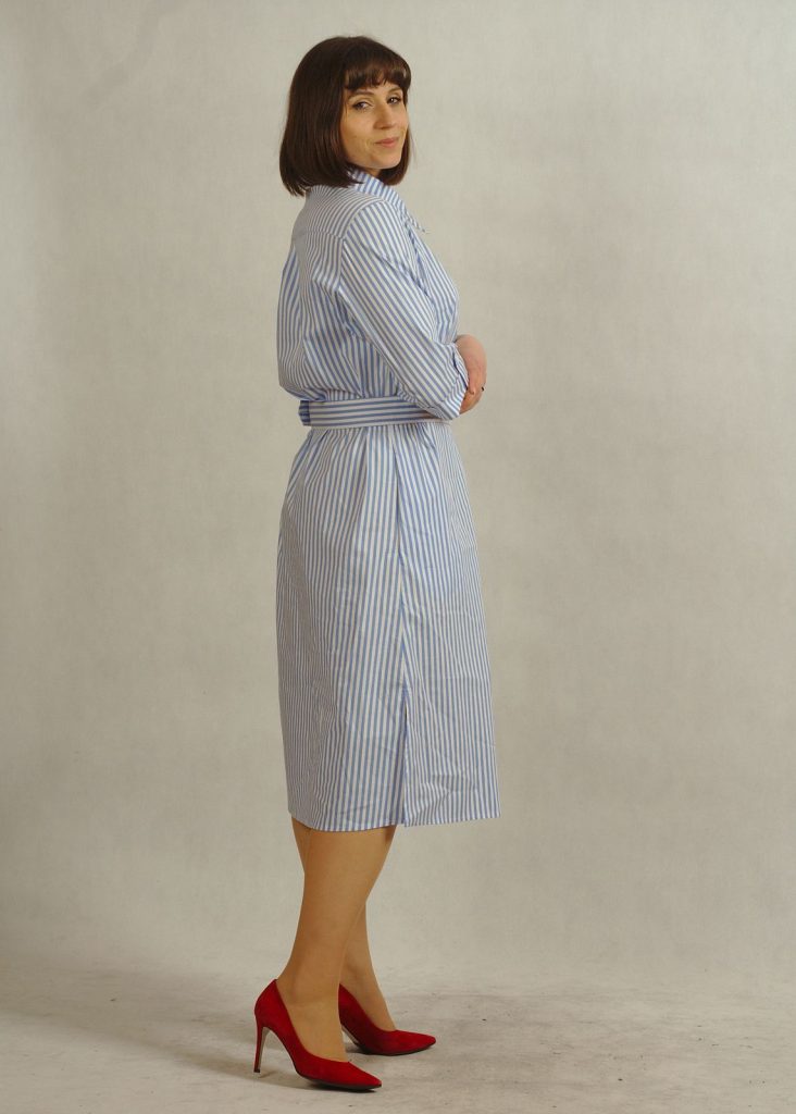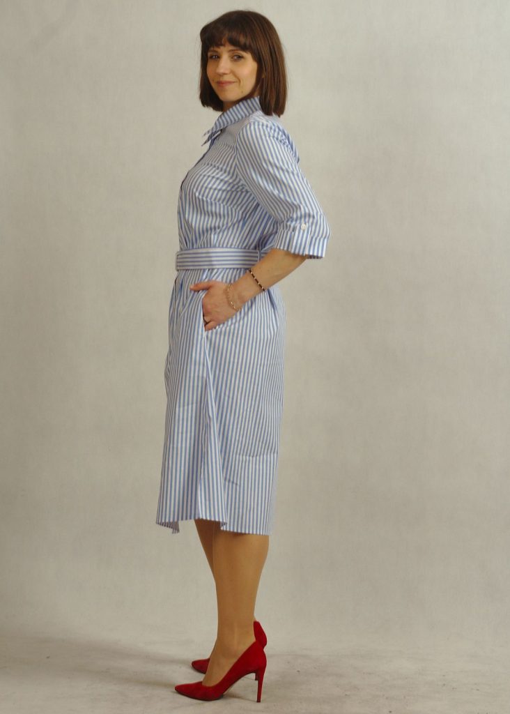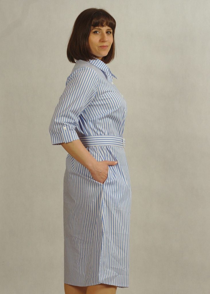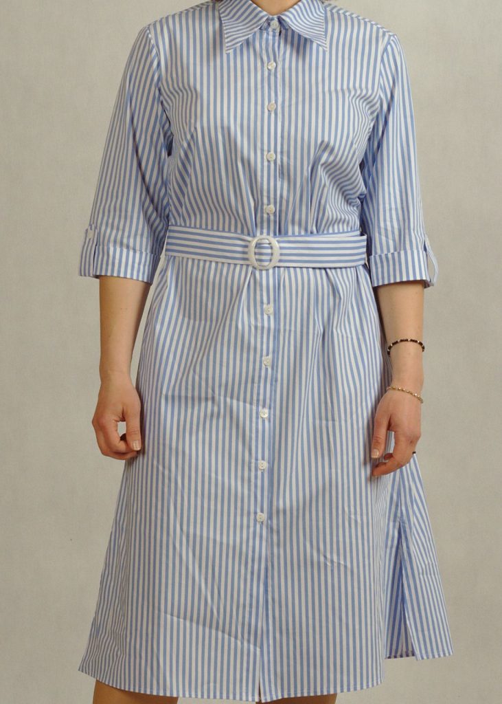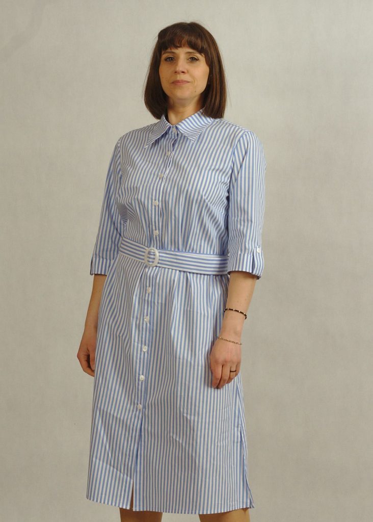 Stylowa sukienka z kołnierzykiem podkreśla klasyczny charakter fasonu, a krój – sukienka koszulowa – zapewnia swobodę ruchów.