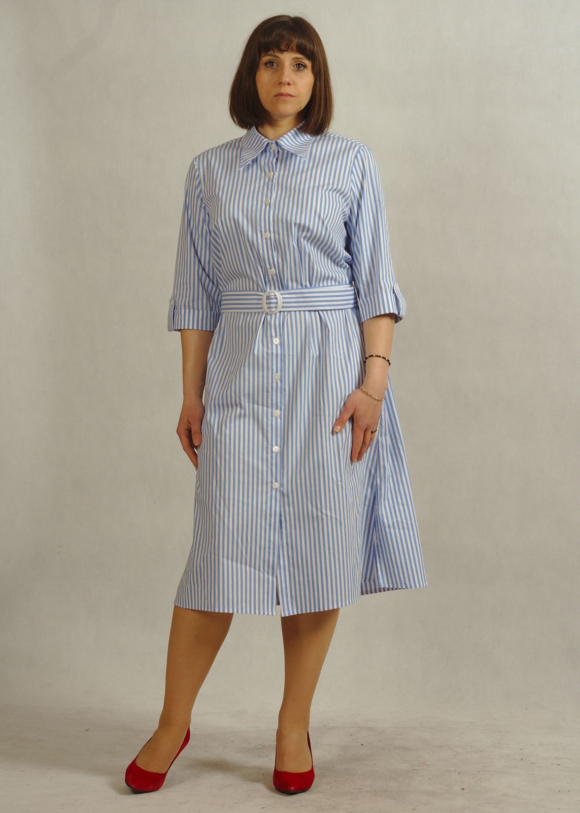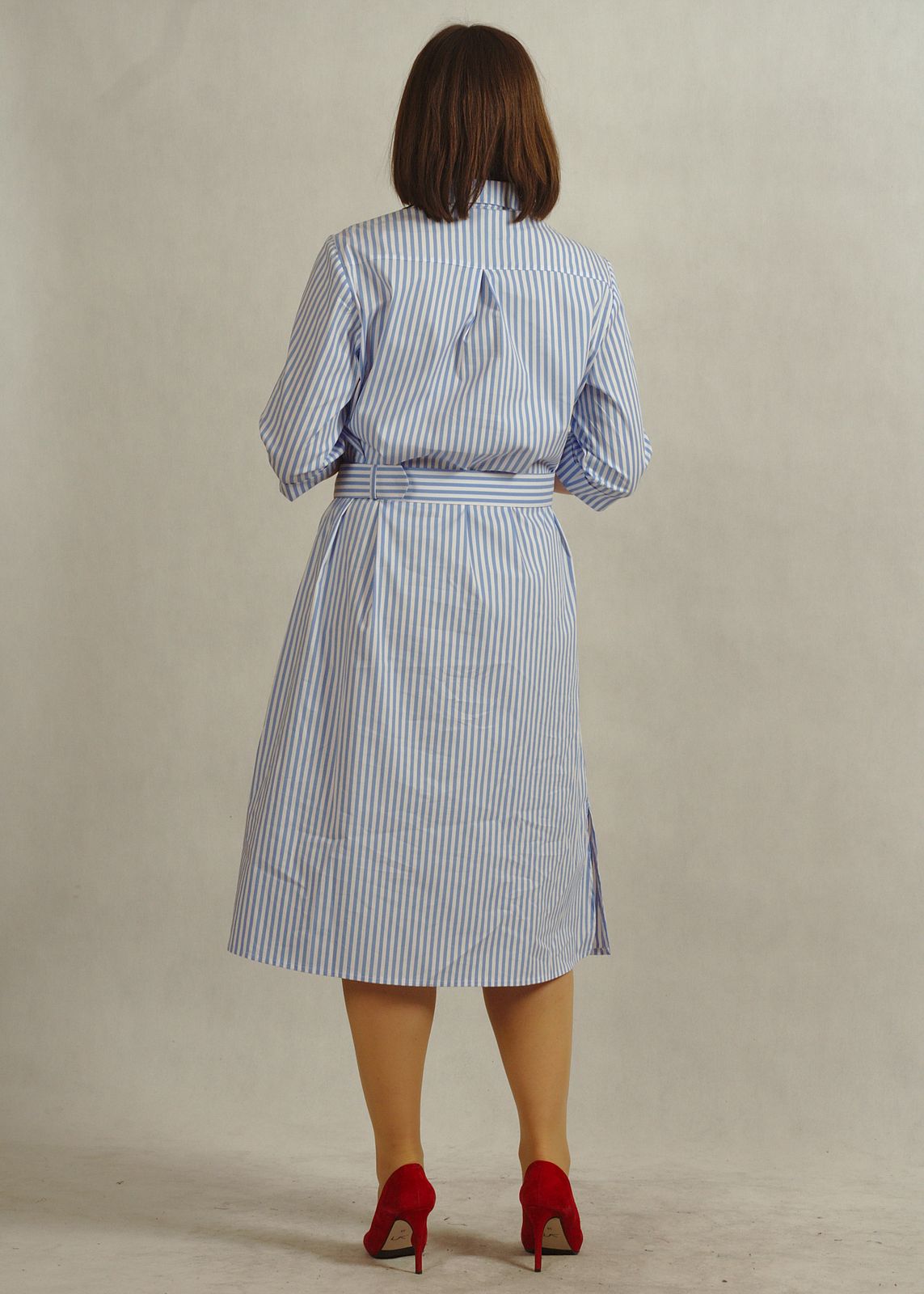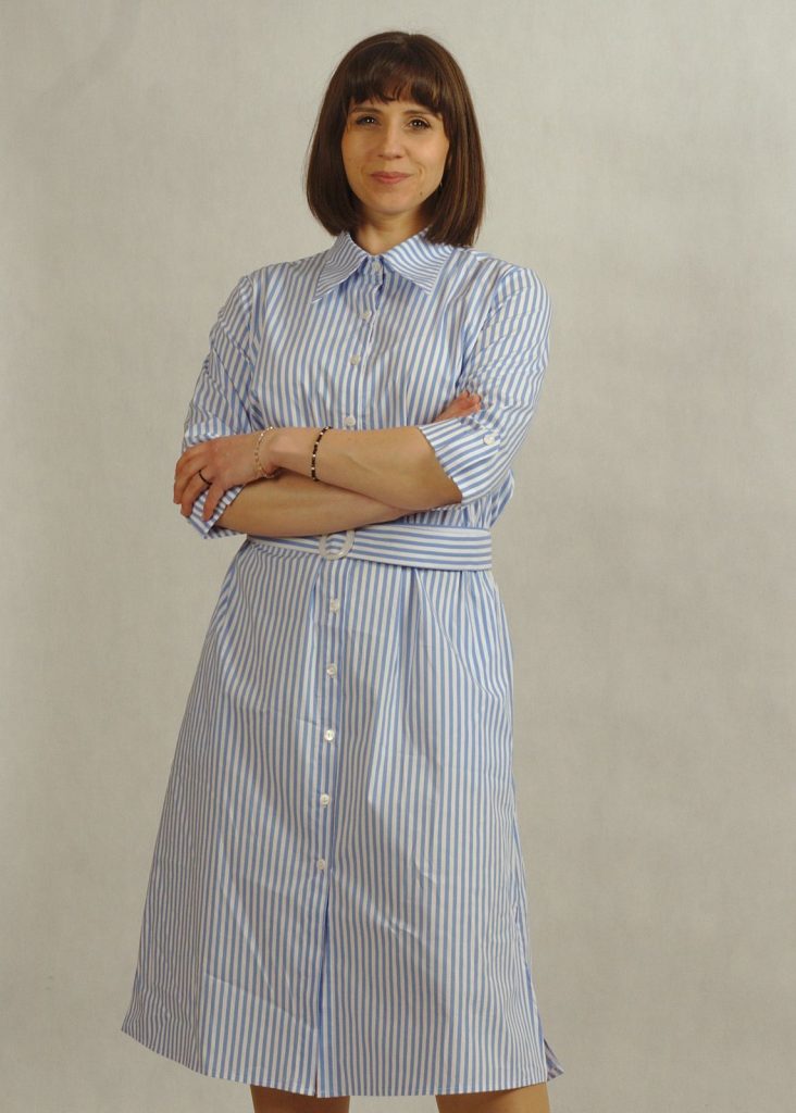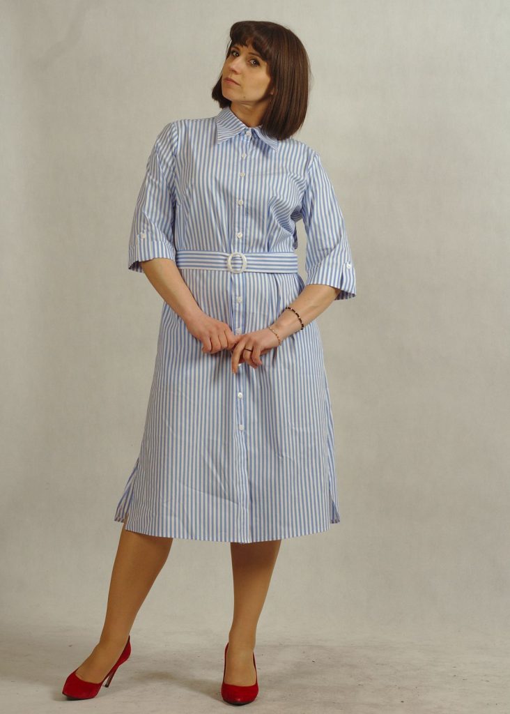 Stylowa sukienka z kołnierzykiem podkreśla klasyczny charakter fasonu, a krój – sukienka koszulowa – zapewnia swobodę ruchów.