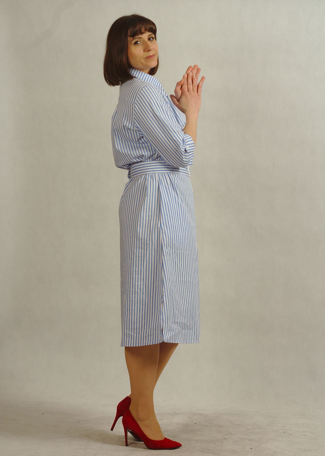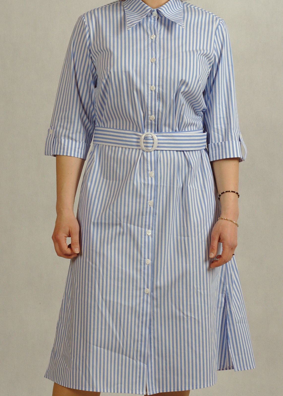 Modna sukienka w paski optycznie wysmukla sylwetkę, a delikatna błękitne paski dodają świeżości stylizacji.