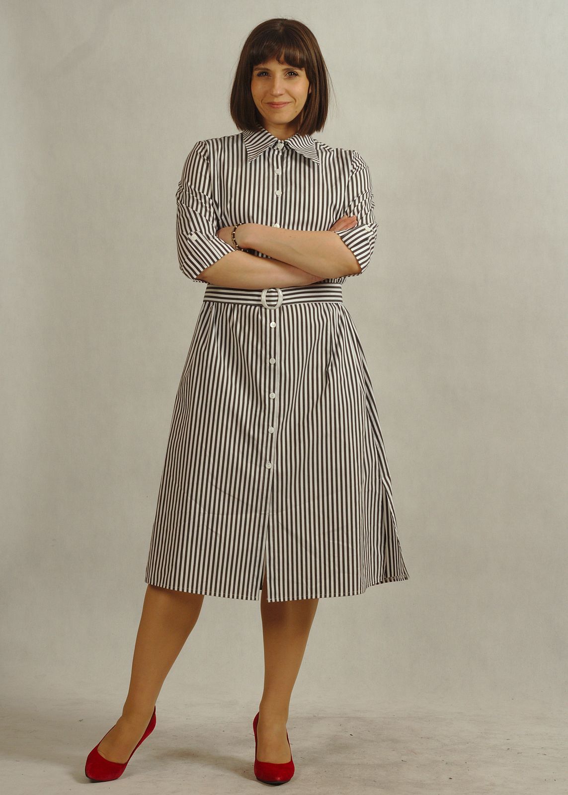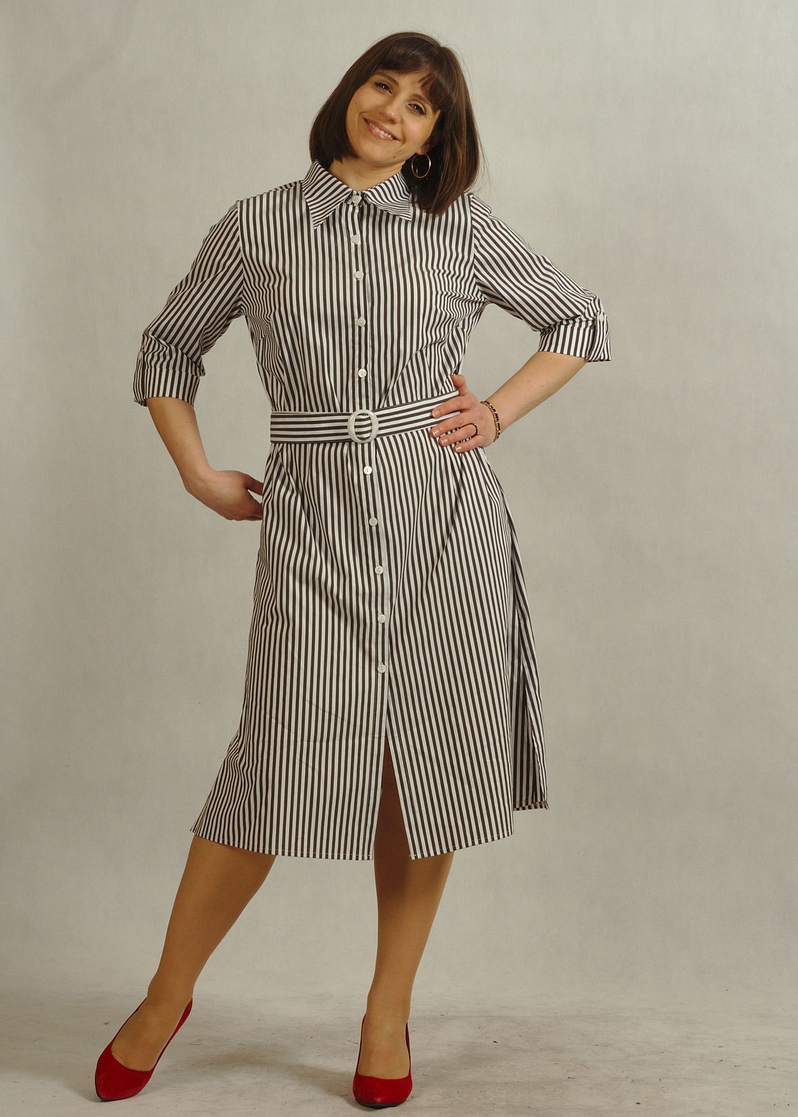 Elegancka sukienka z paskiem modeluje talię i podkreśla proporcje sylwetki.