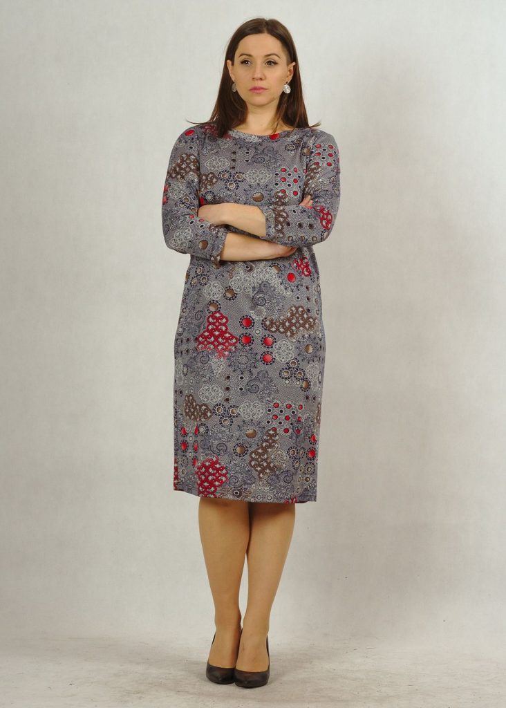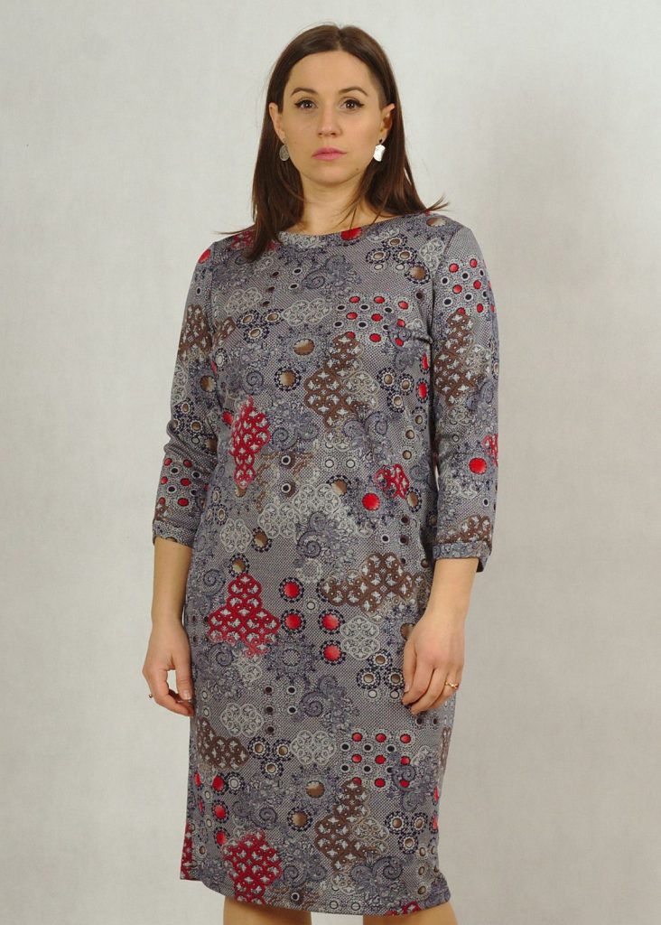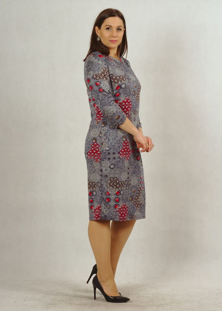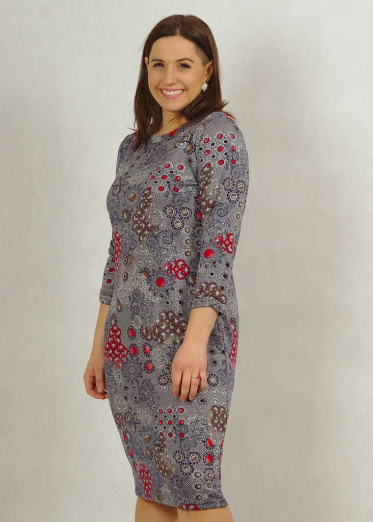 Sukienka z dzianiny o prostym fasonie i z dekoltem w łódkę szara z nadrukiem /518/