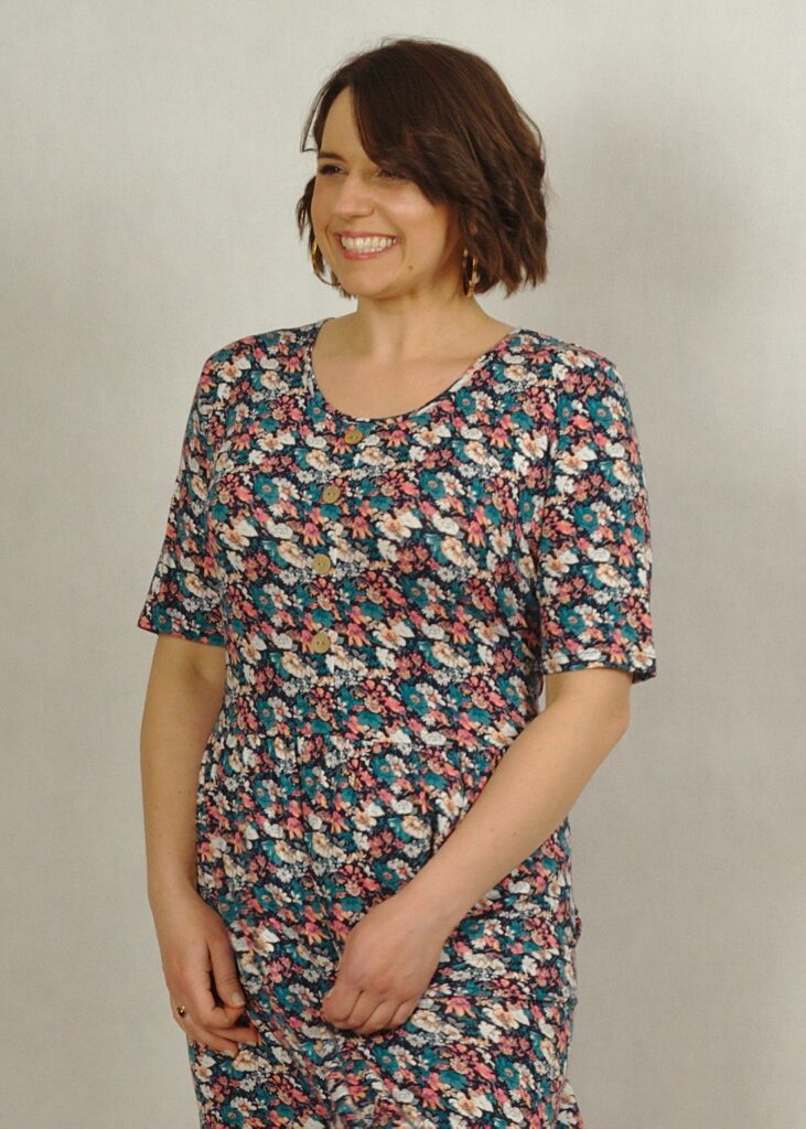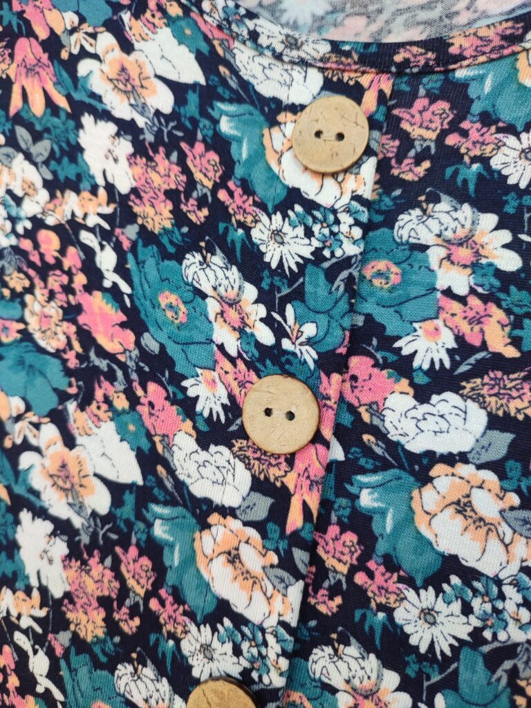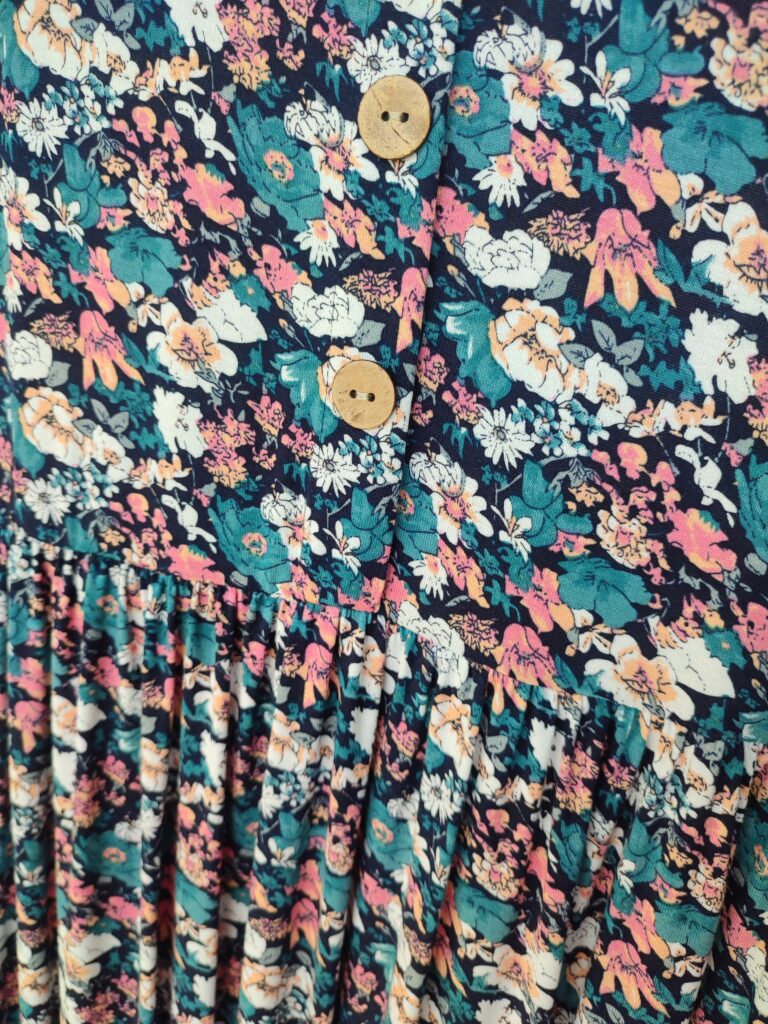Sukienkę w kwiatki delikatnie zdobią kokosowe guziki.