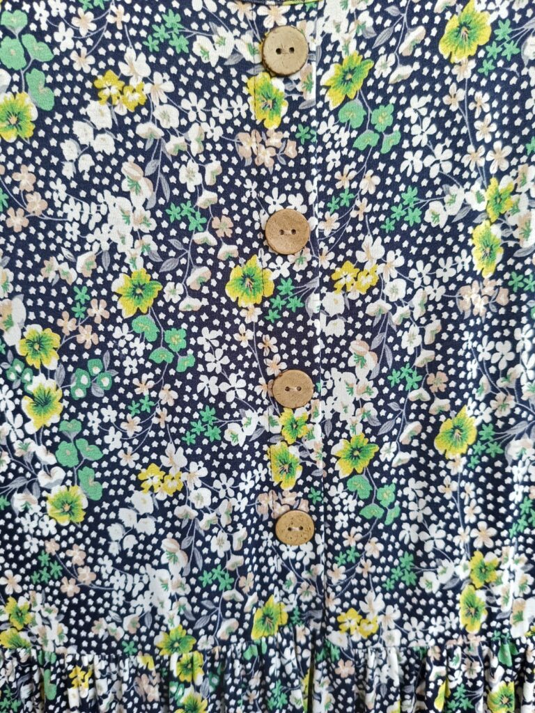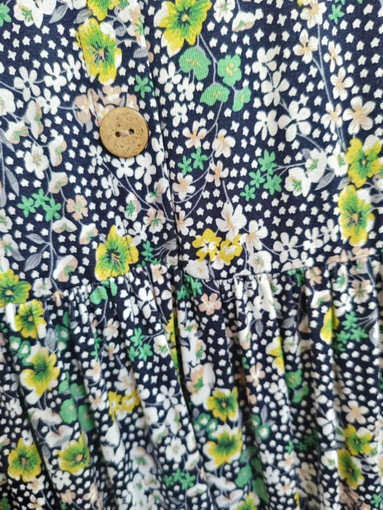 Sukienkę delikatnie zdobią kokosowe guziki.