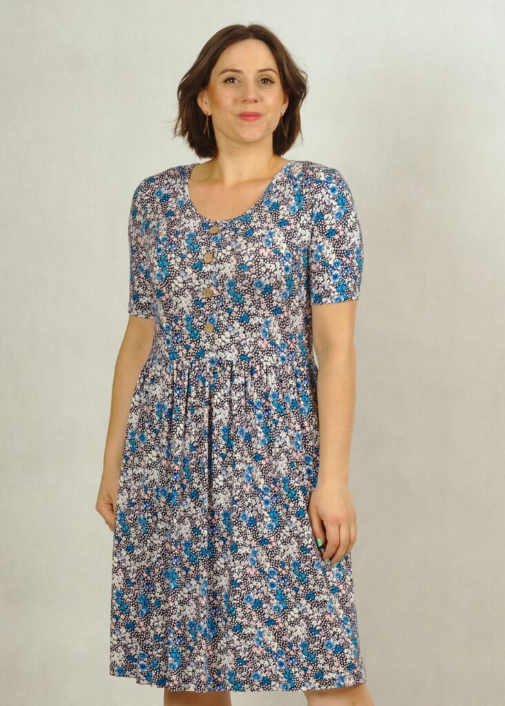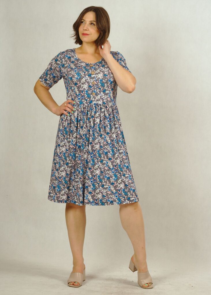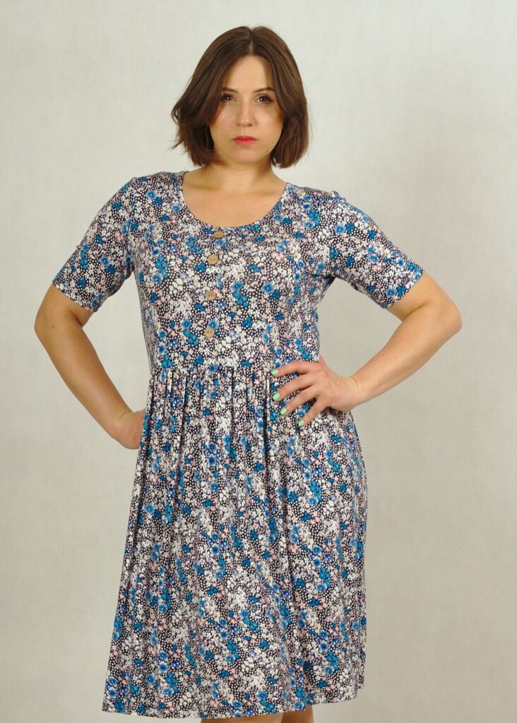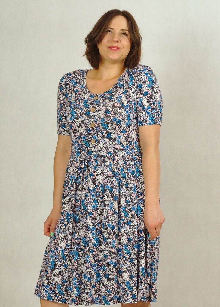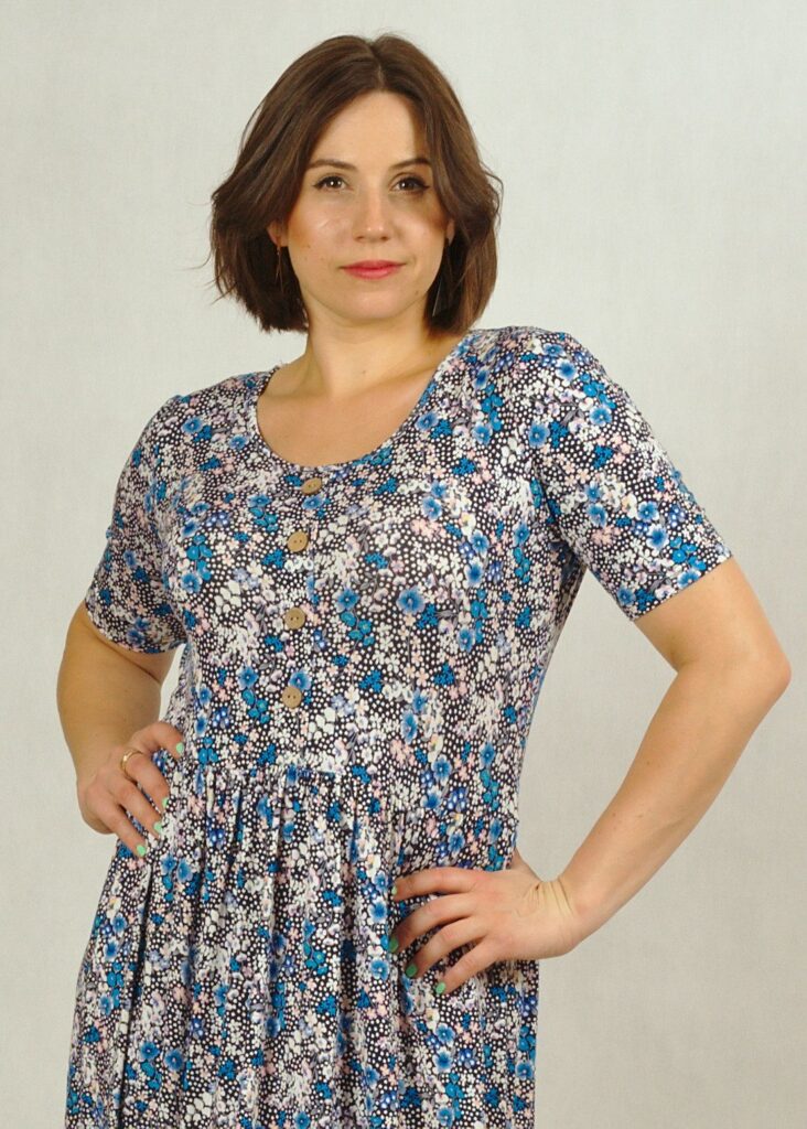 Sukienka z dzianiny w niebieskie kwiatki z guzikami plus size /685/