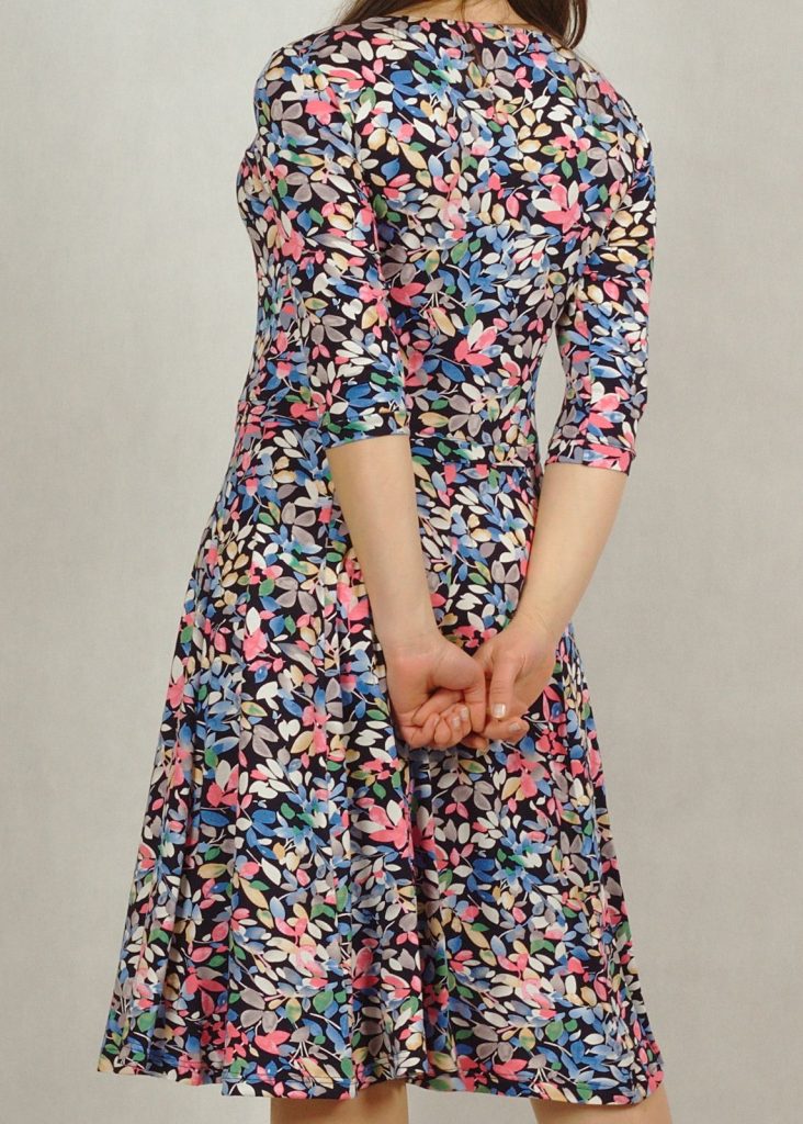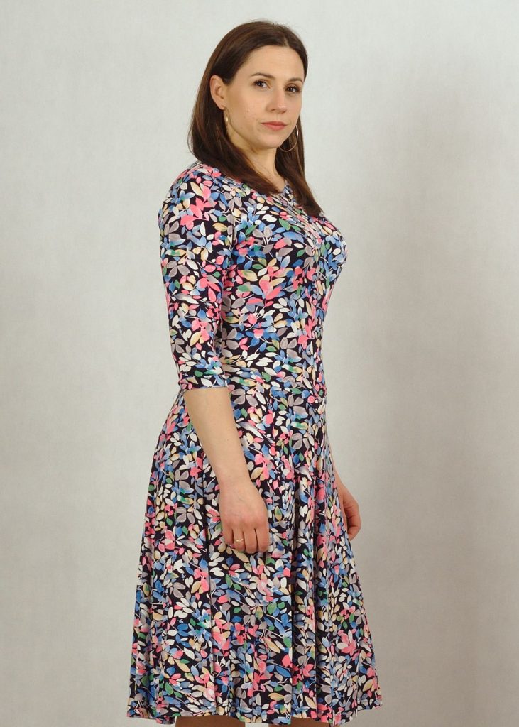 Dół sukienki lekko poszerzany, wyprofilowany cięciami.