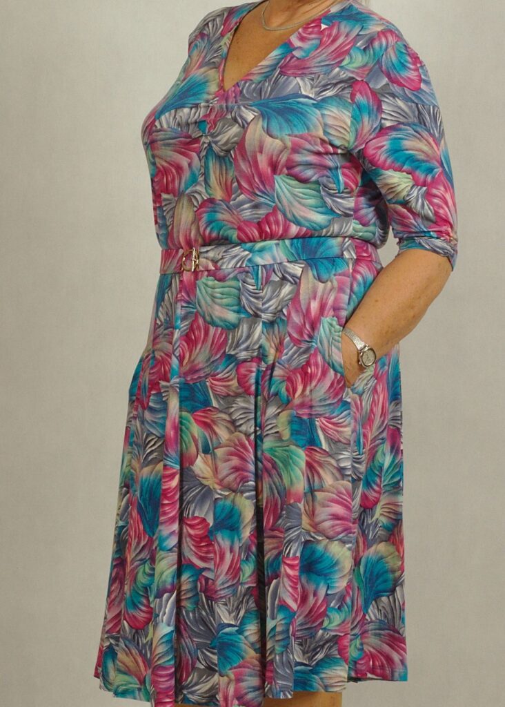 Model z dekoltem w serek, rękawem 3/4, paskiem i praktycznymi kieszeniami podkreśla kobiecą sylwetkę.