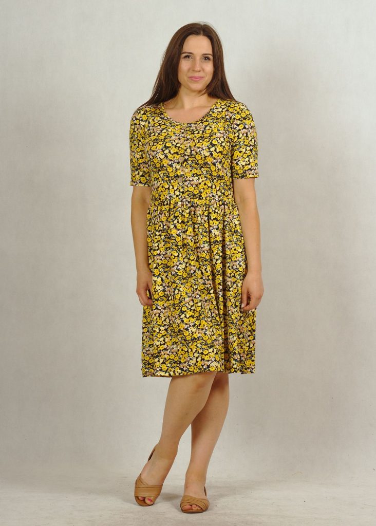 Niezwykle wygodna sukienka dzianinowa na krótki rękaw. Posiada półokrągły dekolt ozdobiony czterema “kokosowymi” guziczkami.
