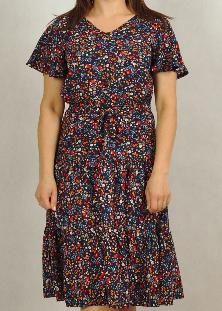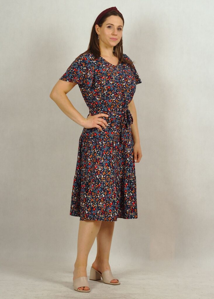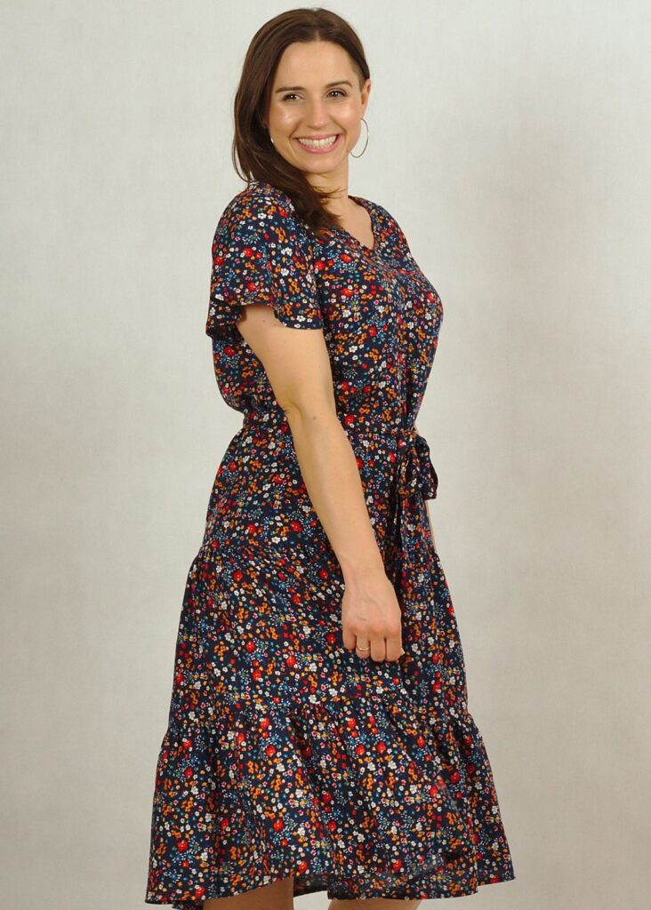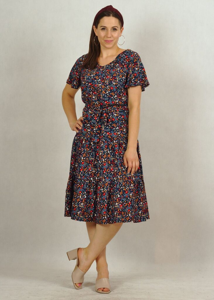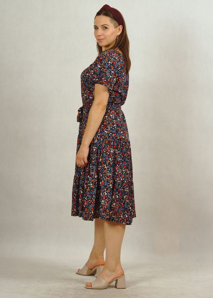 Kolor bazowy sukienki to granat, a drobne kwiatuszki są w odcieniach fioletu i różu.