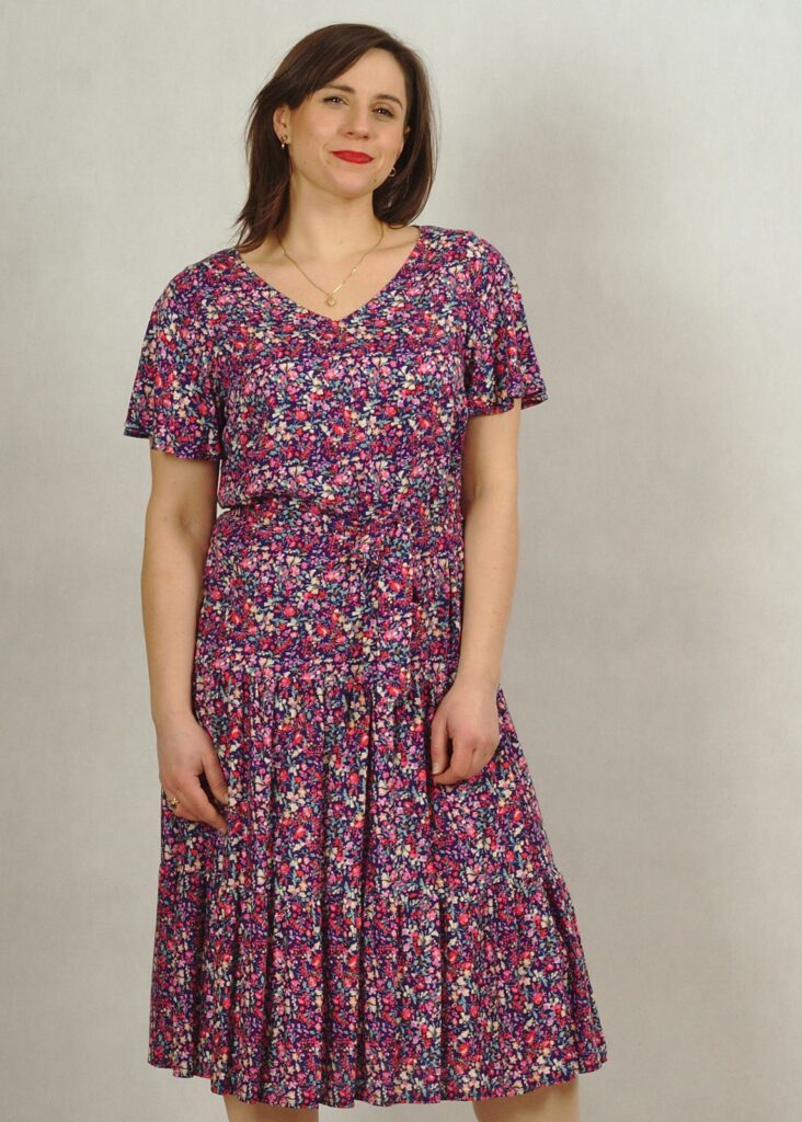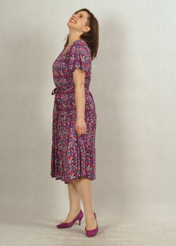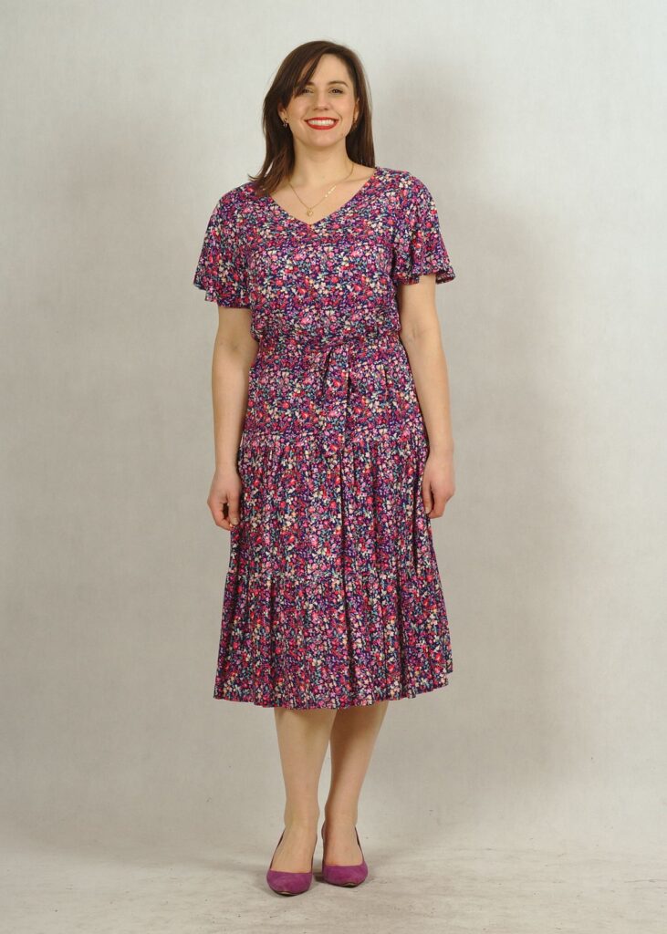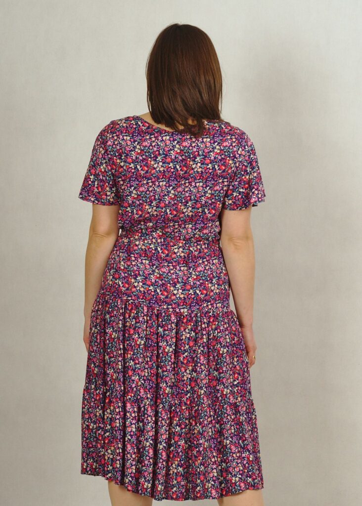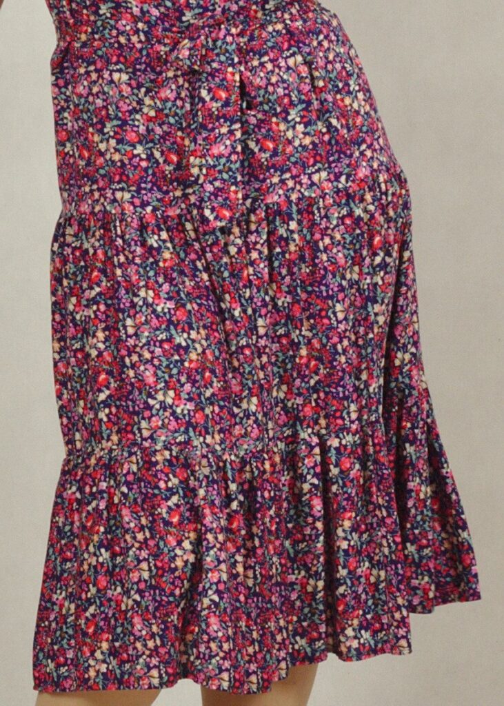 Kolor bazowy sukienki to granat, a drobne kwiatuszki są w odcieniach fioletu i różu.