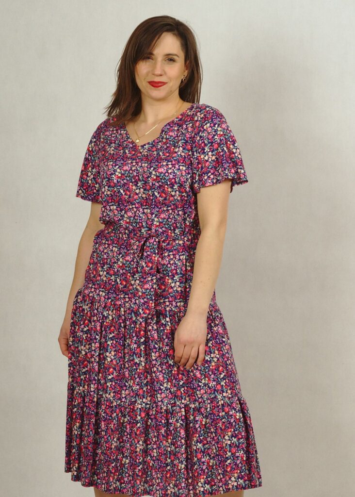 Śliczna, tkaninowa sukienka z falbanami na dole. Uszyta w Polsce, z dbałością o każdy szczegół.
