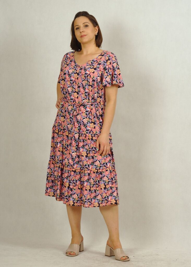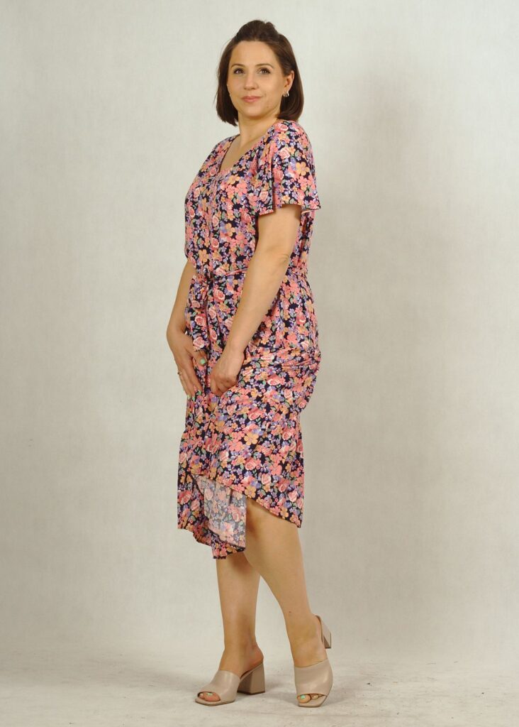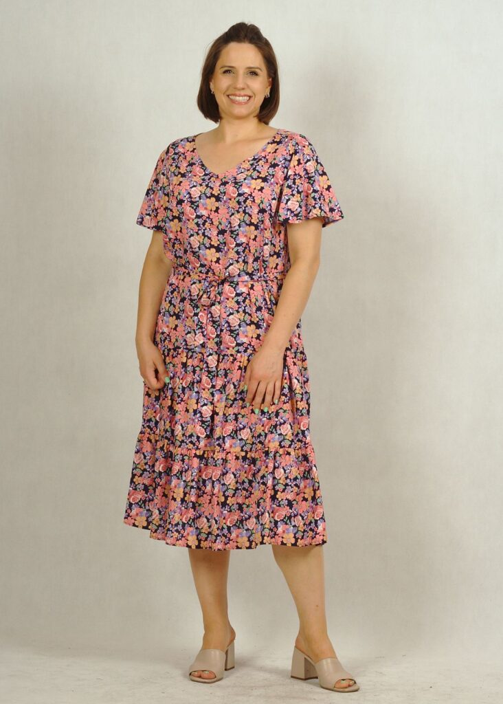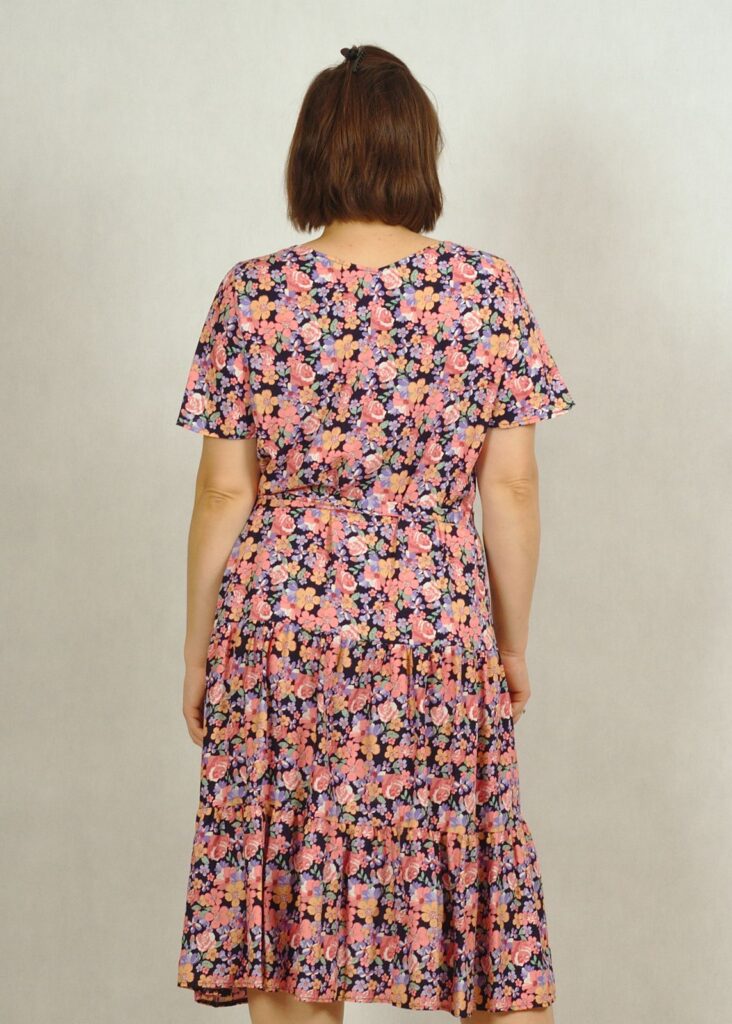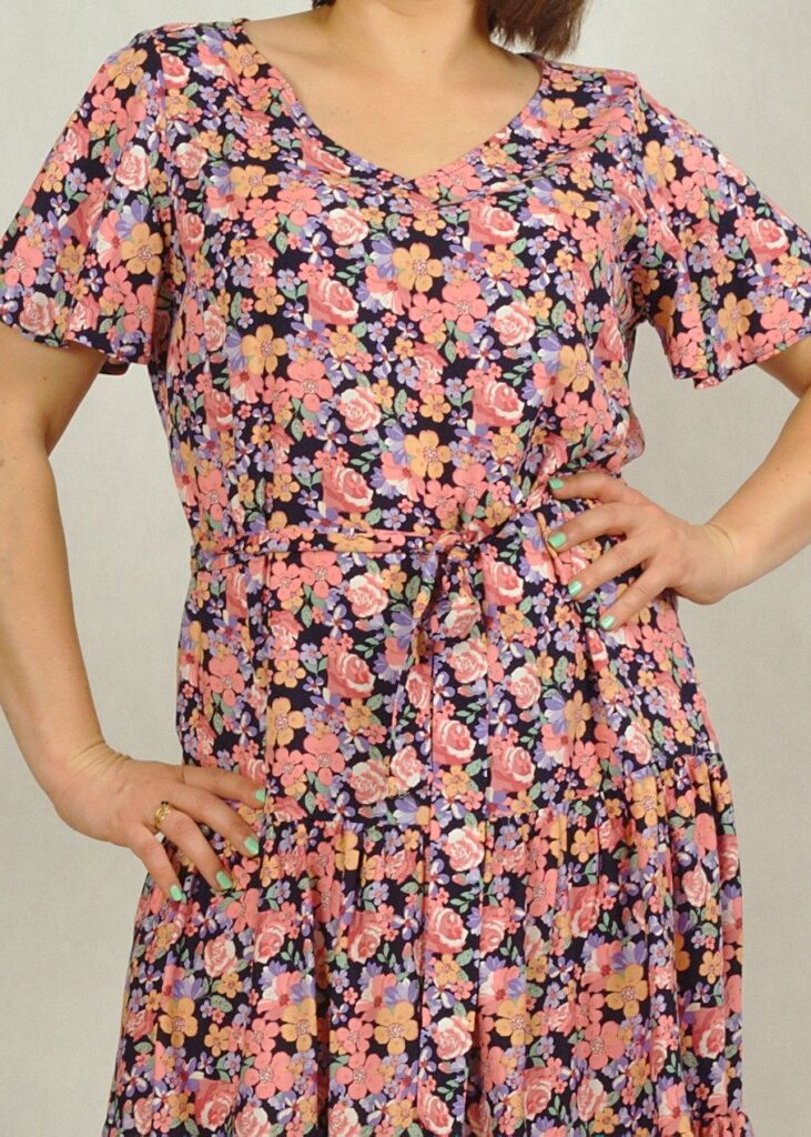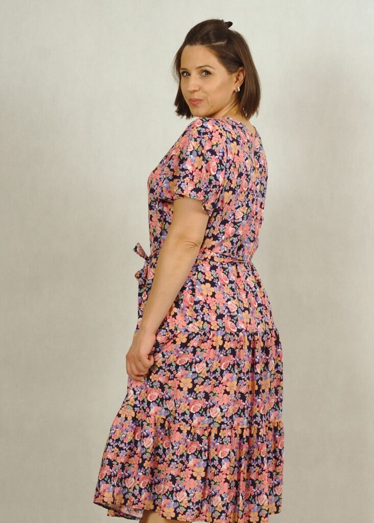 Dekolt w serek, pięknie podkreśla biust. Rękawek jest krótki, zwiewny a’la motylek, nadaje sukience lekkości.