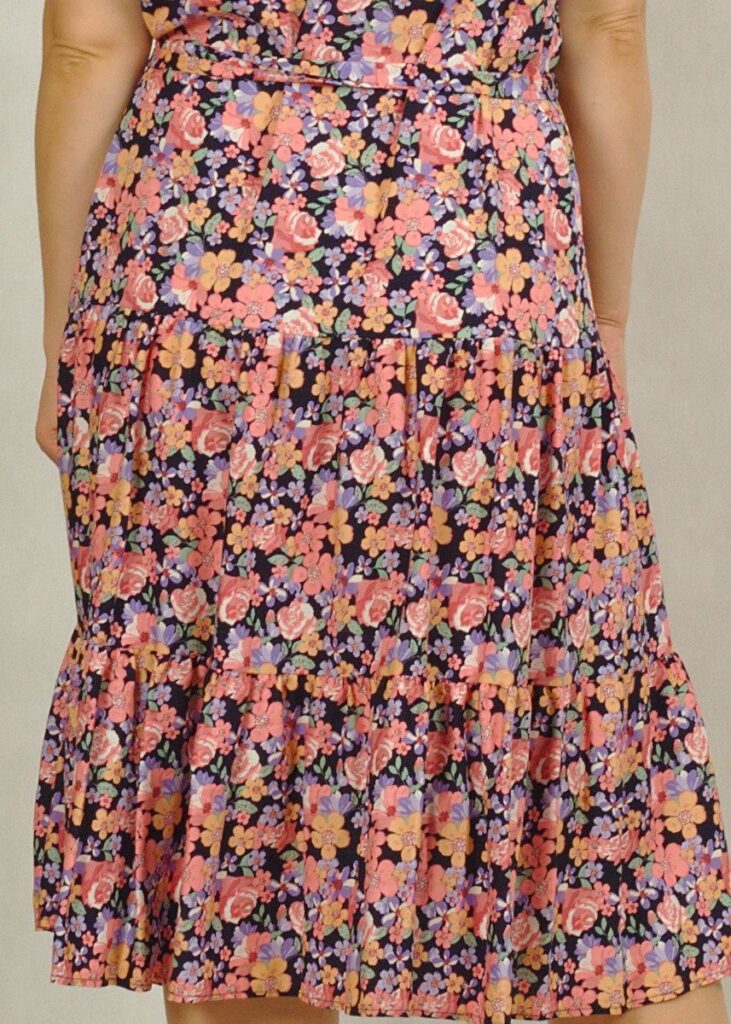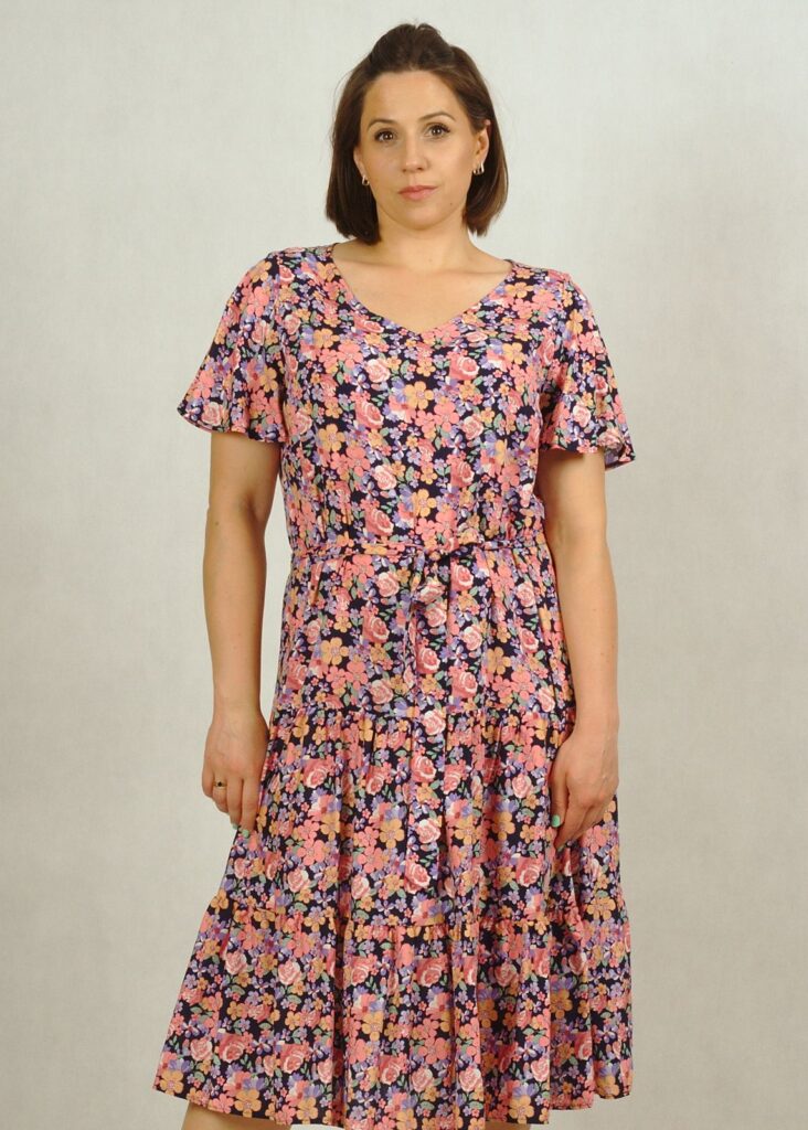 Śliczna, tkaninowa sukienka z falbanami na dole. Uszyta w Polsce, z dbałością o każdy szczegół.