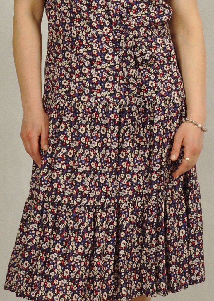 Niezwykle romantyczna, tkaninowa sukienka z falbanami na dole. W całości uszyta w Polsce, z dbałością o każdy szczegół.