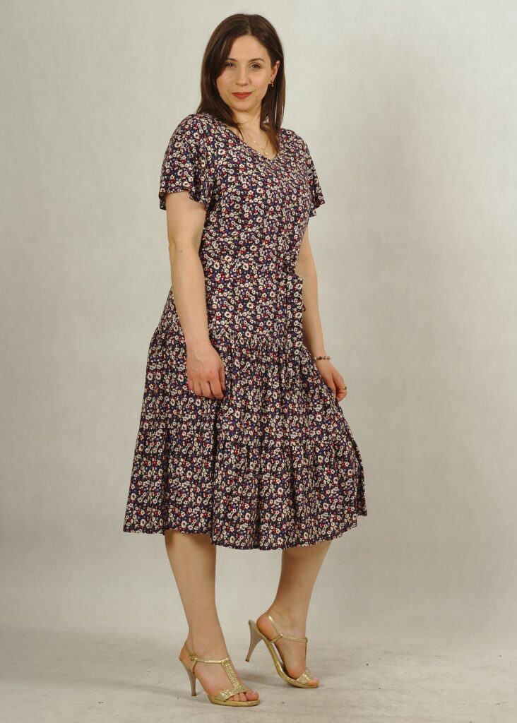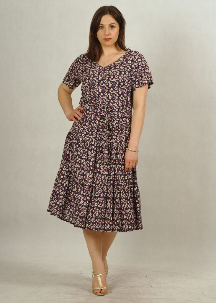 Kolor bazowy sukienki to granat, a drobne kwiatuszki są w kolorze białym, chabrowym i czerwonym*.