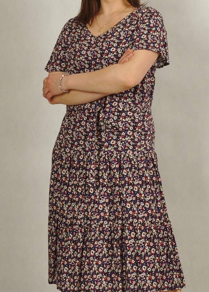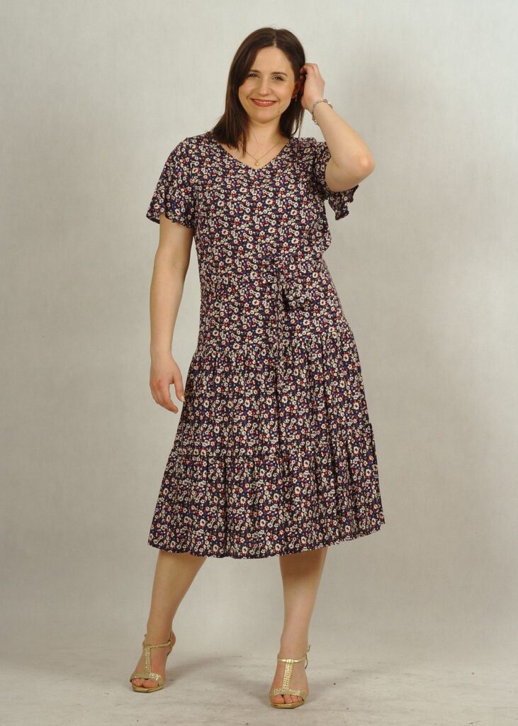 Dekolt w serek, pięknie podkreśla dekolt. Rękawek jest krótki, zwiewny a’la motylek, nadaje sukience lekkości.