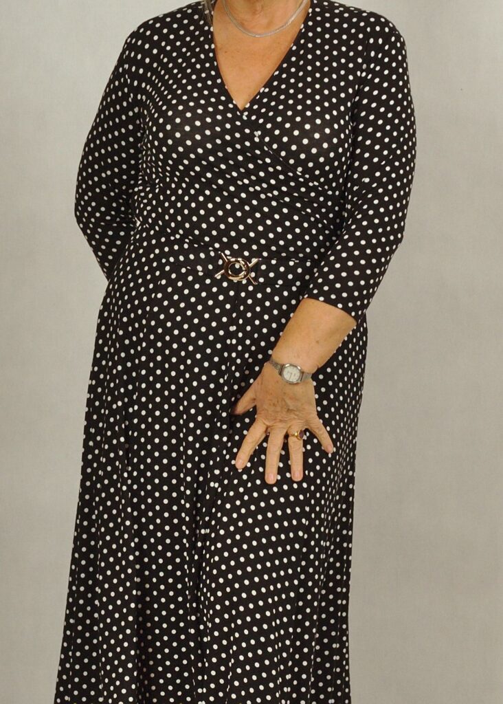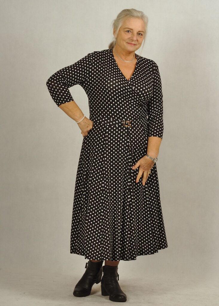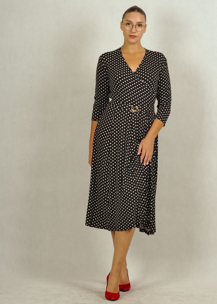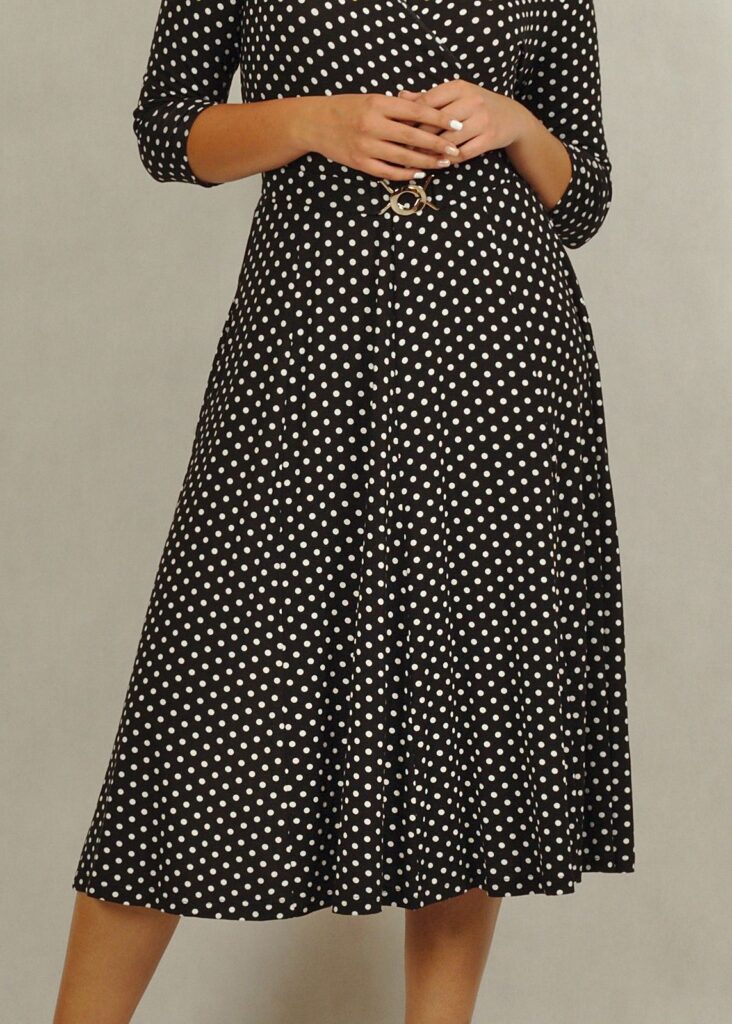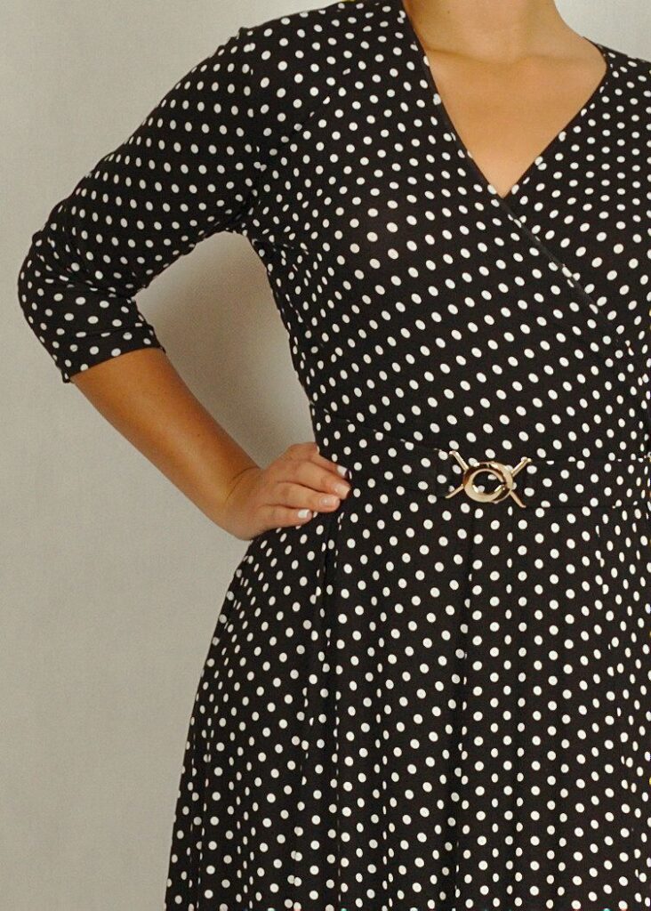 Sukienka ma kolor bazowy czarny*. To klasyka, która w połączeniu z drobnymi białymi groszkami tworzy ponadczasową stylizację.
