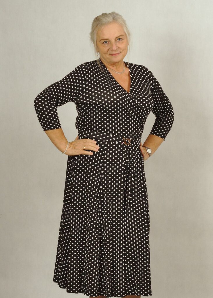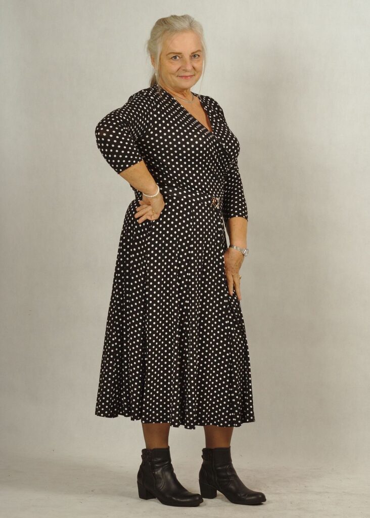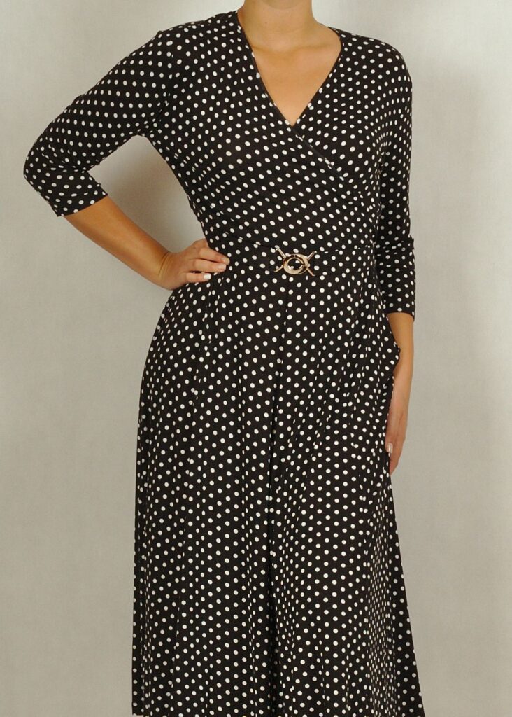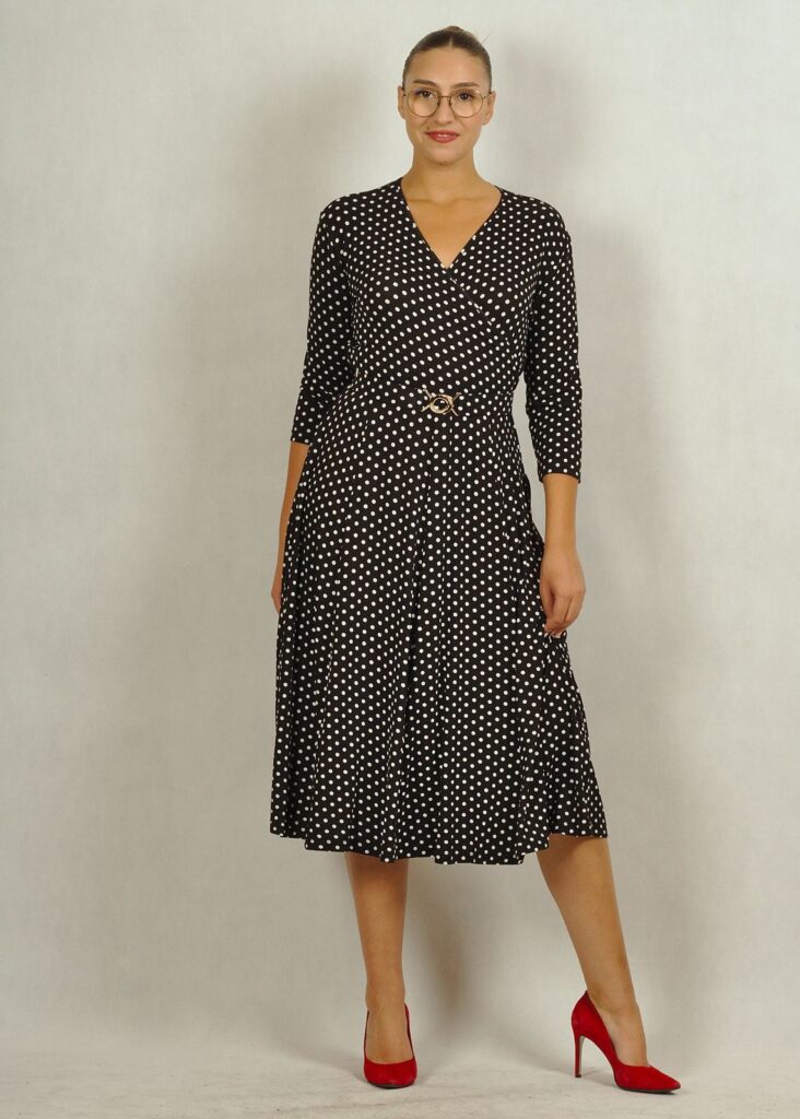 To sukienka czarna w groszki, która przepięknie podkreśla biust oraz talię i do odpowiedniego obuwia może być bardzo elegancka.
