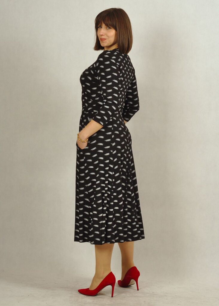 Długość sukienki – midi, a dół sukienki jest lekko poszerzany w kliny.