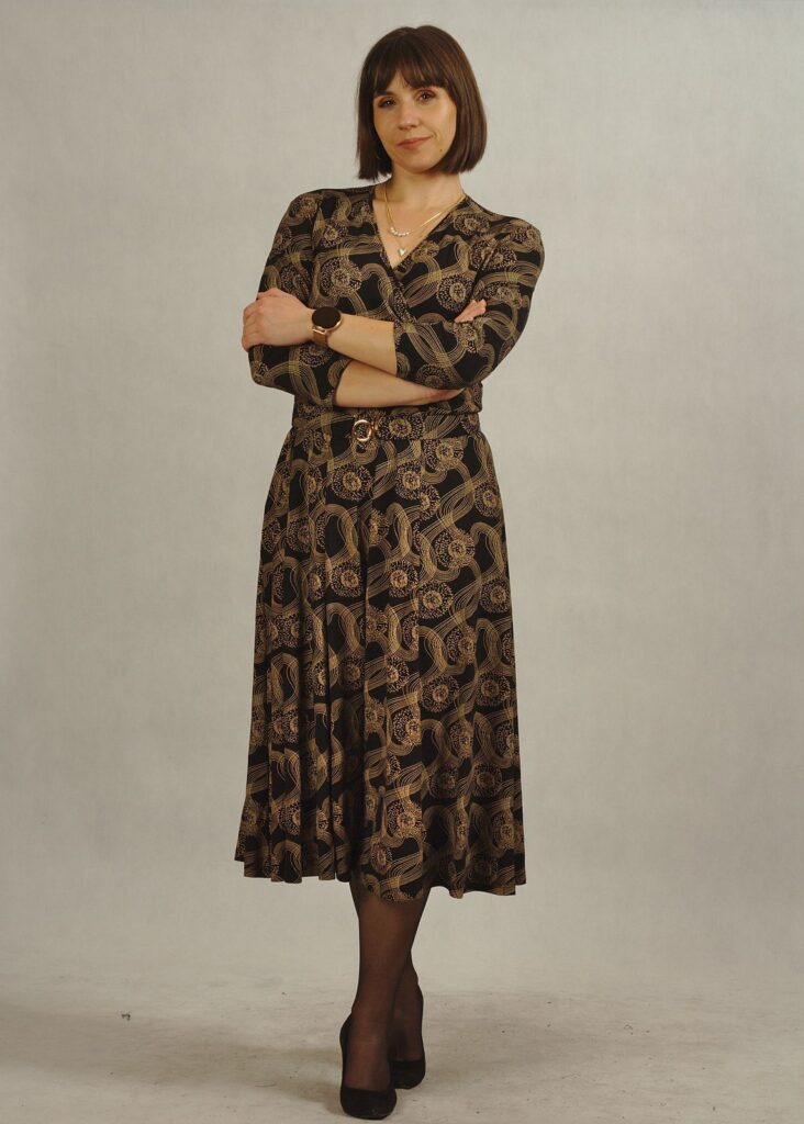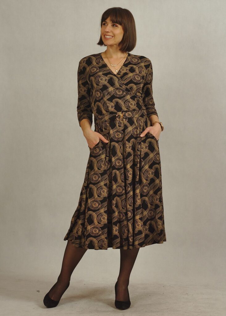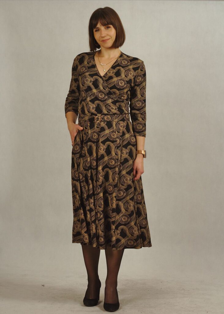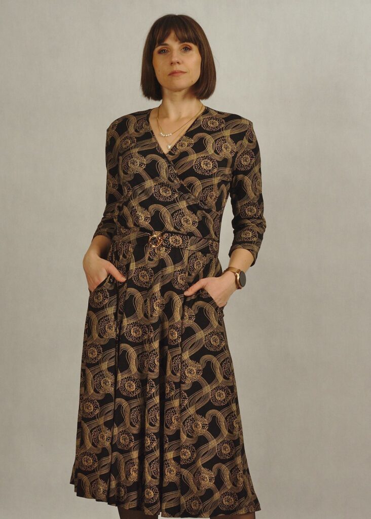 Sukienka midi czarna w złote wzory, to propozycja, która łączy w sobie elegancję i wygodę.