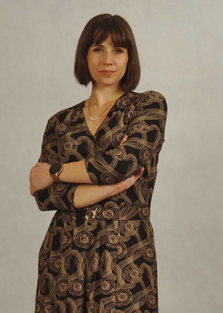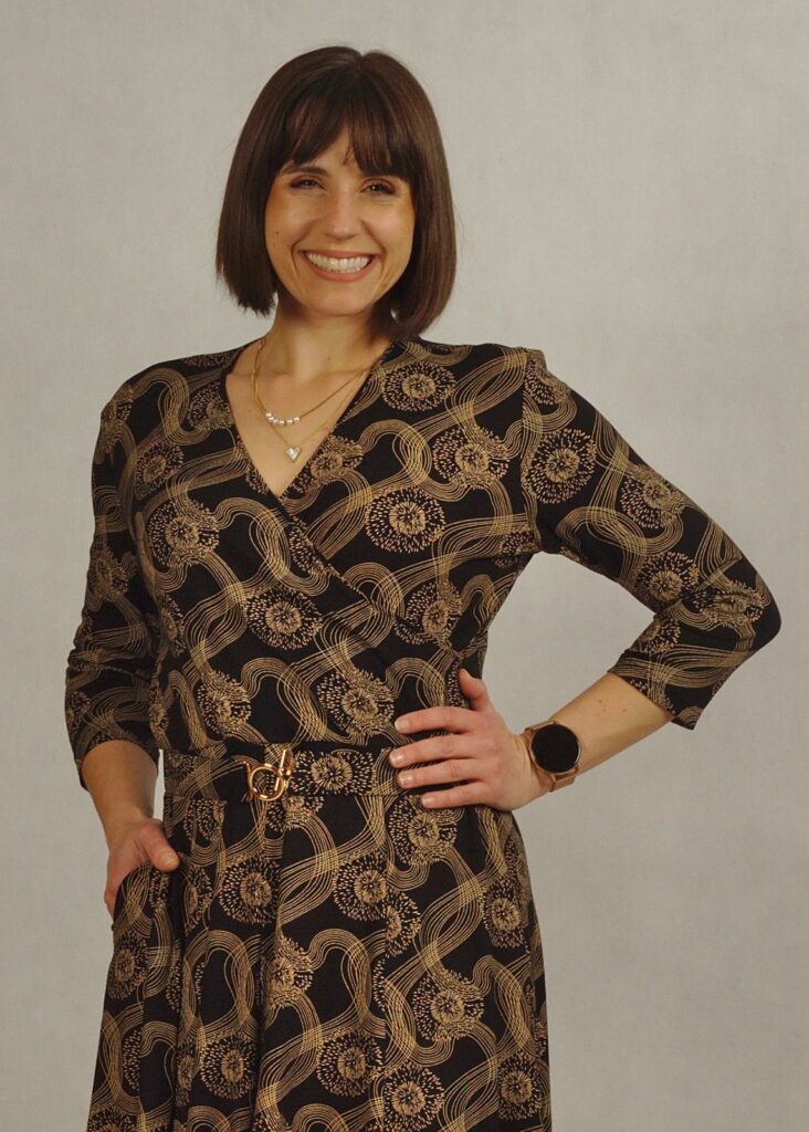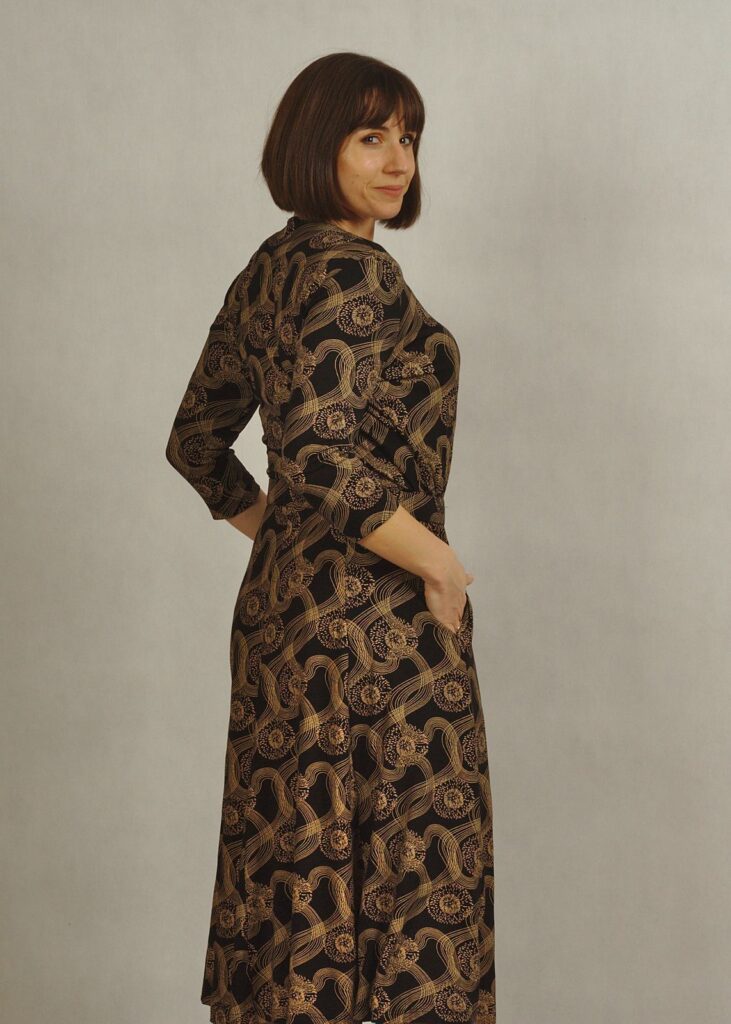 Sukienka ciemna, urozmaicona delikatnymi kontrastami, podkreśla sylwetkę, a jednocześnie pozostaje niezwykle komfortowa.