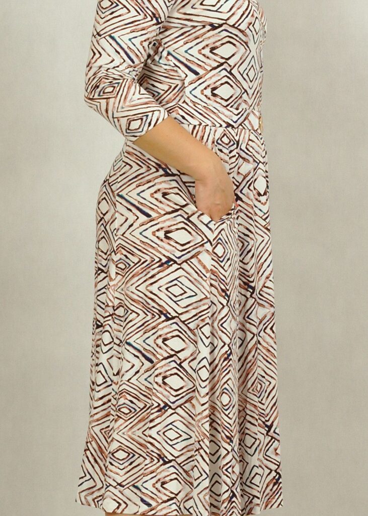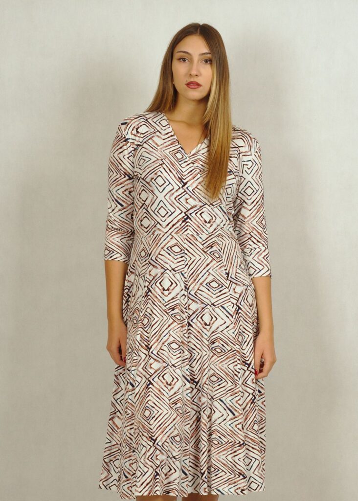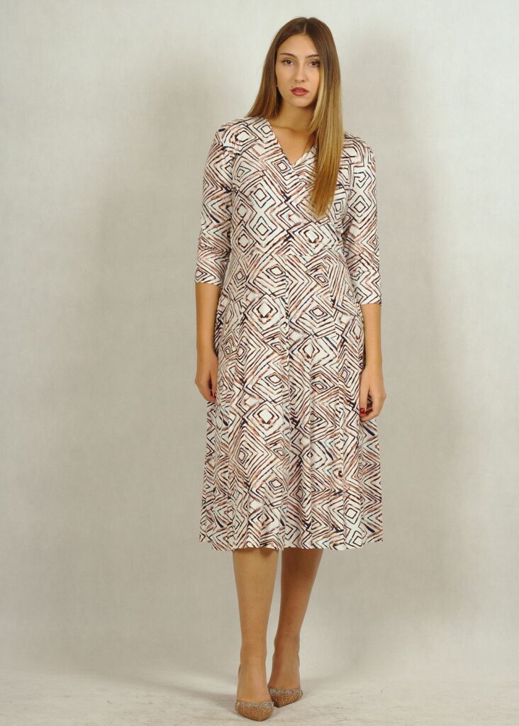 Sukienka z kopertowym dekoltem ecru w brązowe wzory /757/