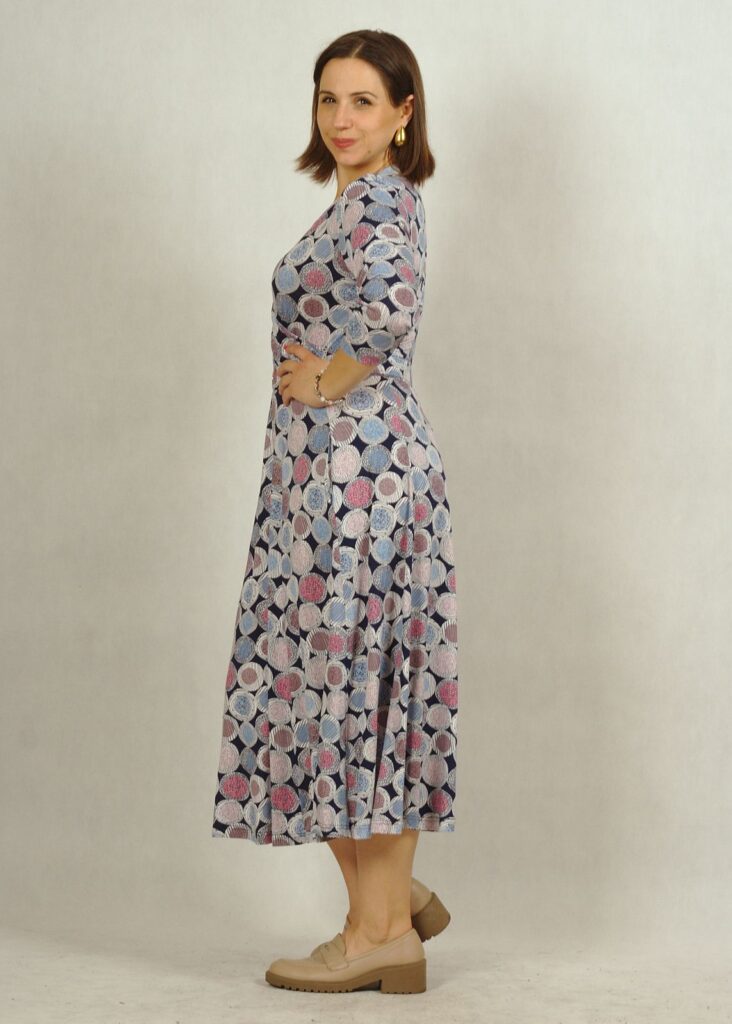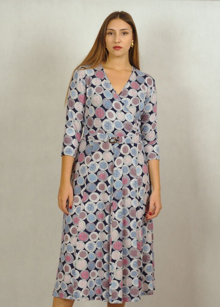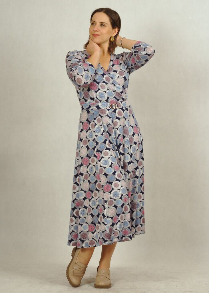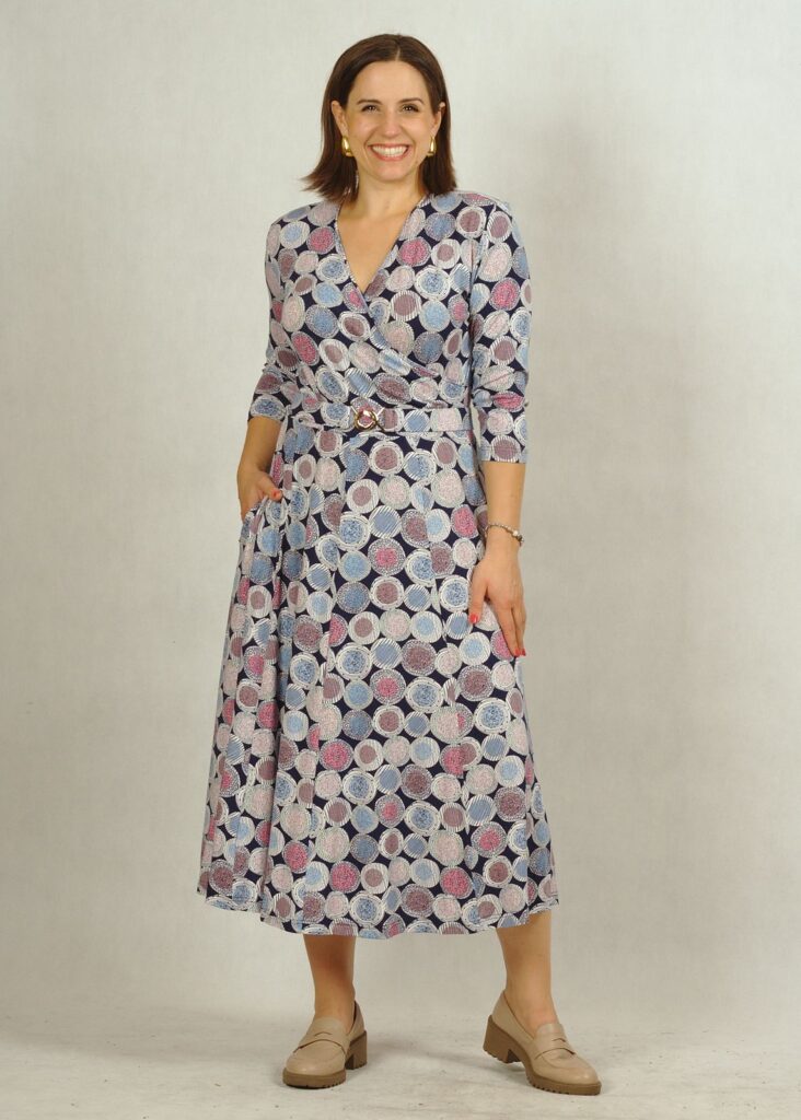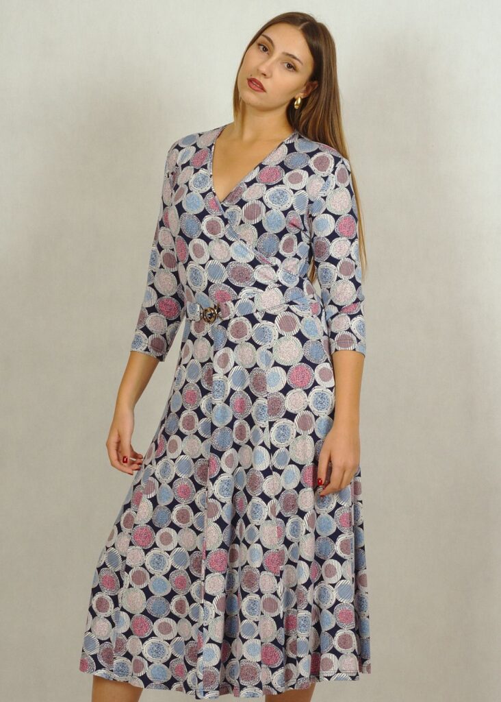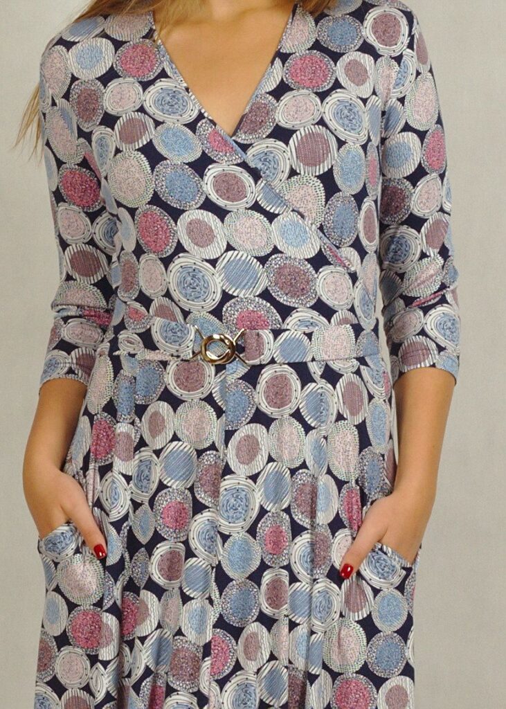 Sukienka z kopertowym dekoltem granatowa w pastelowe kółka/757/
