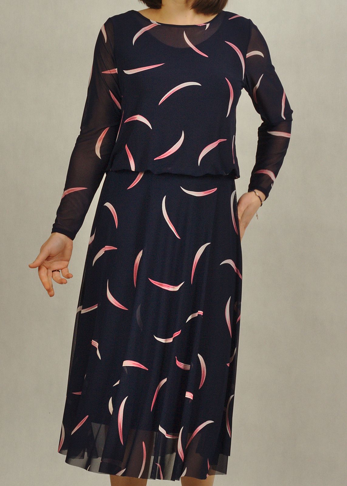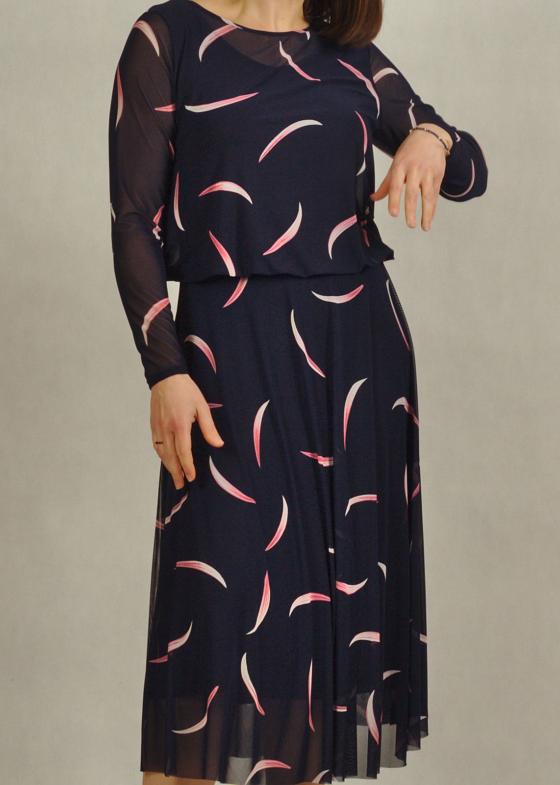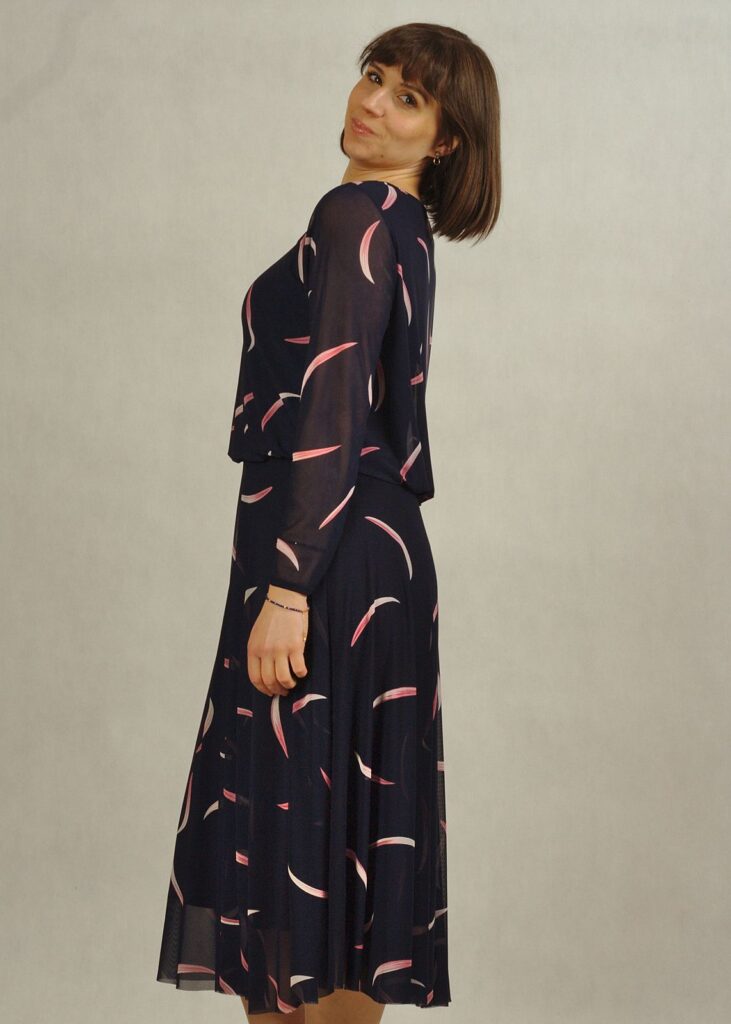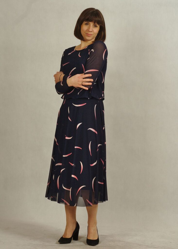 Elegancka sukienka granatowa w różowe wzory zachwyca subtelnością i oryginalnością.