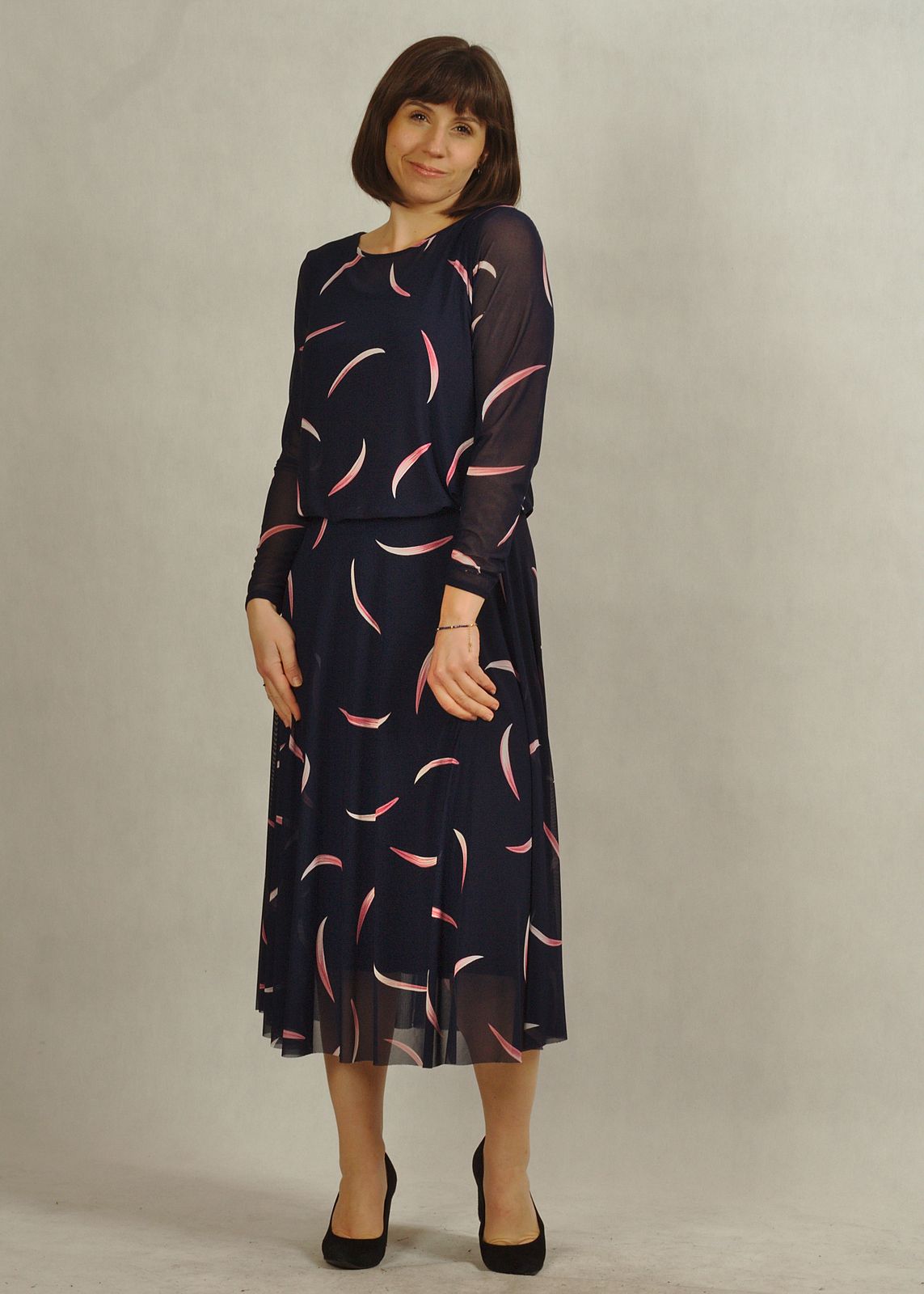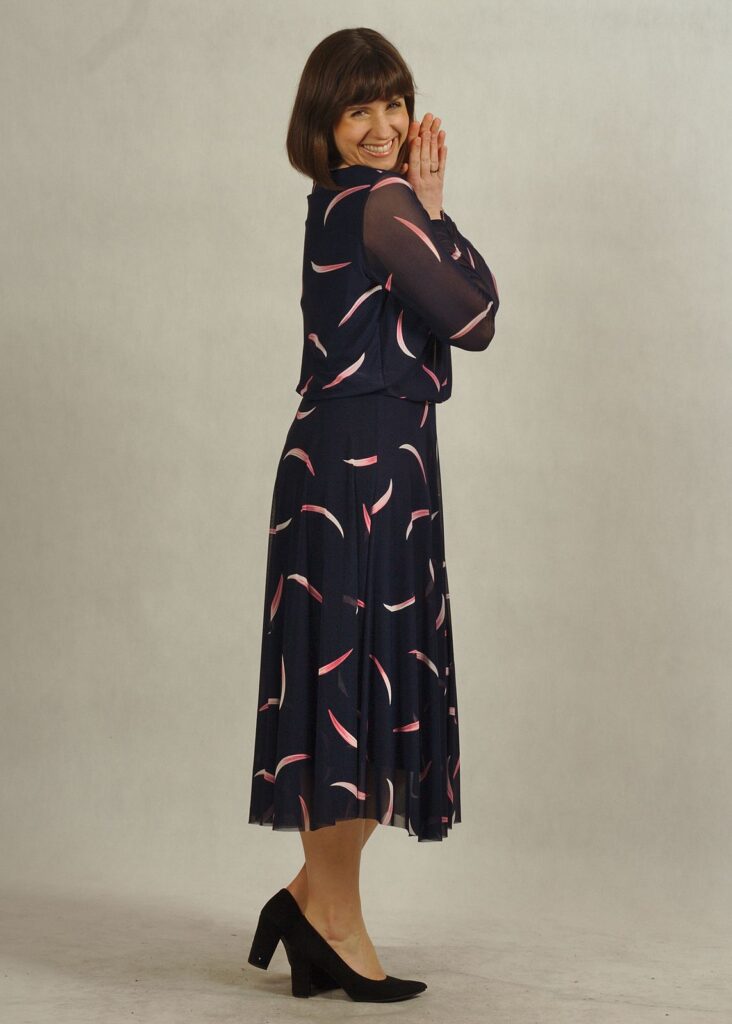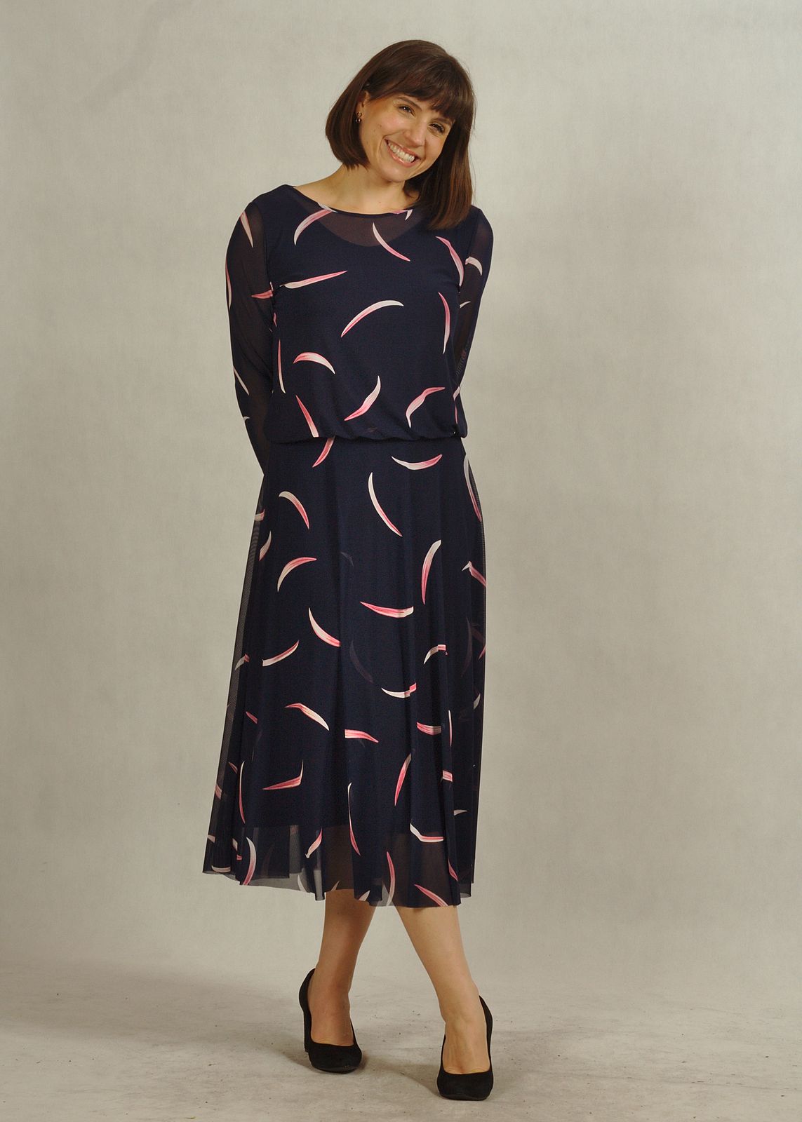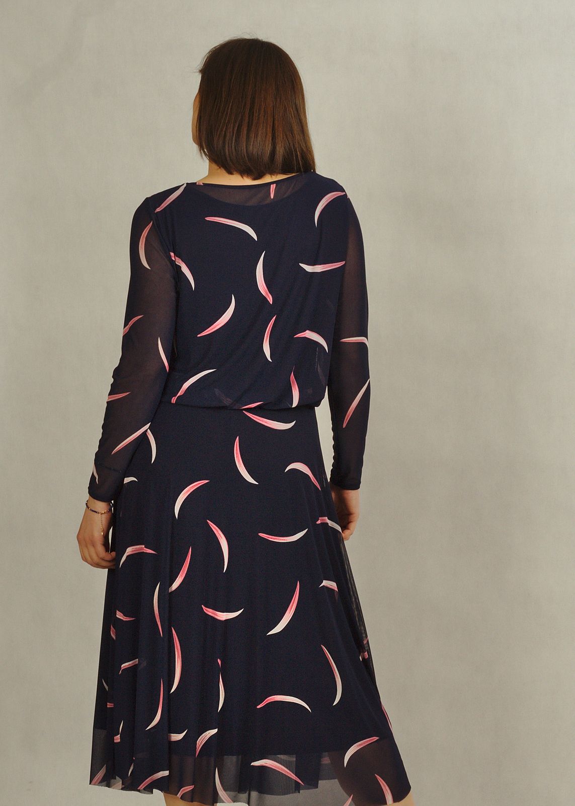 Elegancka sukienka granatowa w różowe wzory zachwyca subtelnością i oryginalnością.
