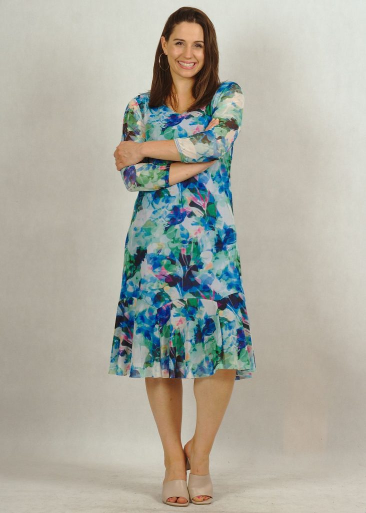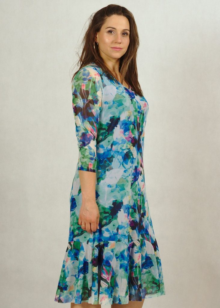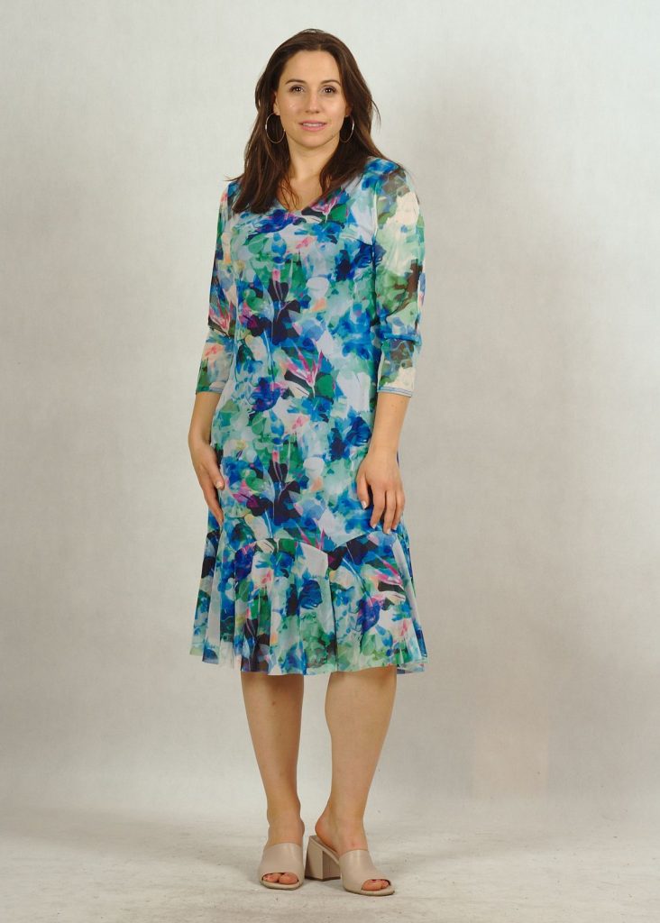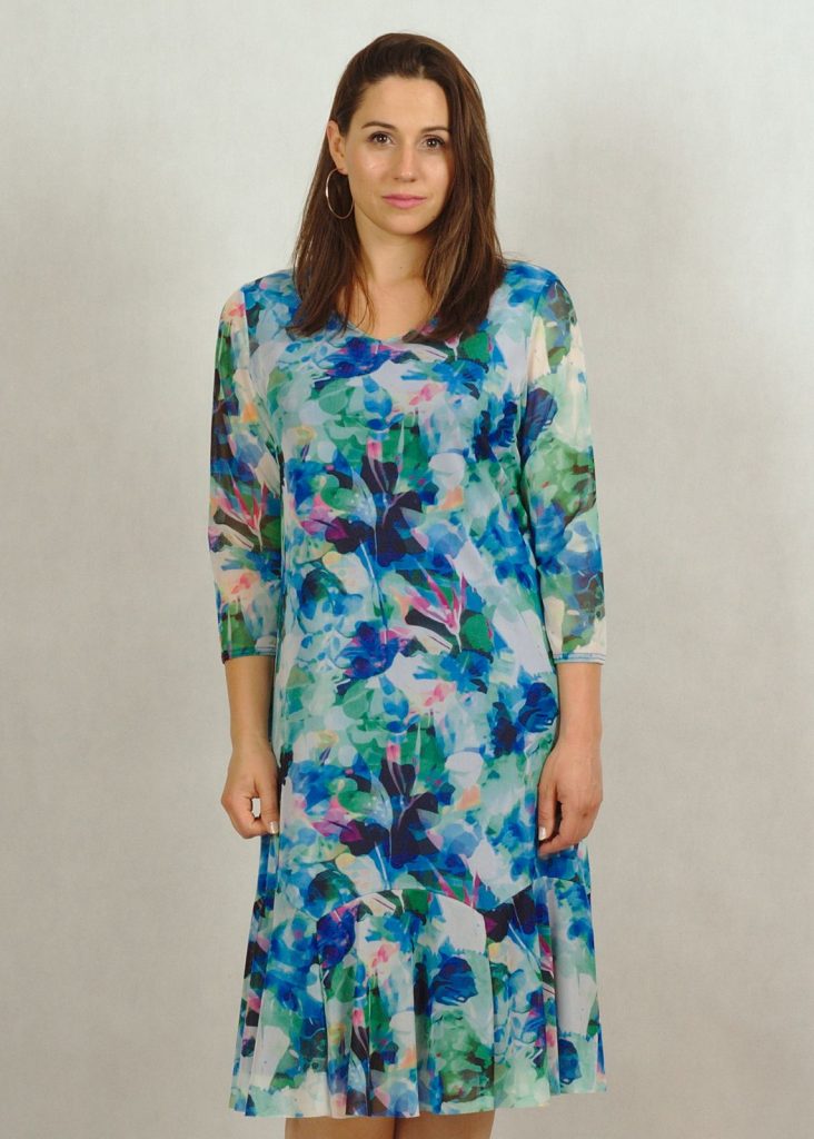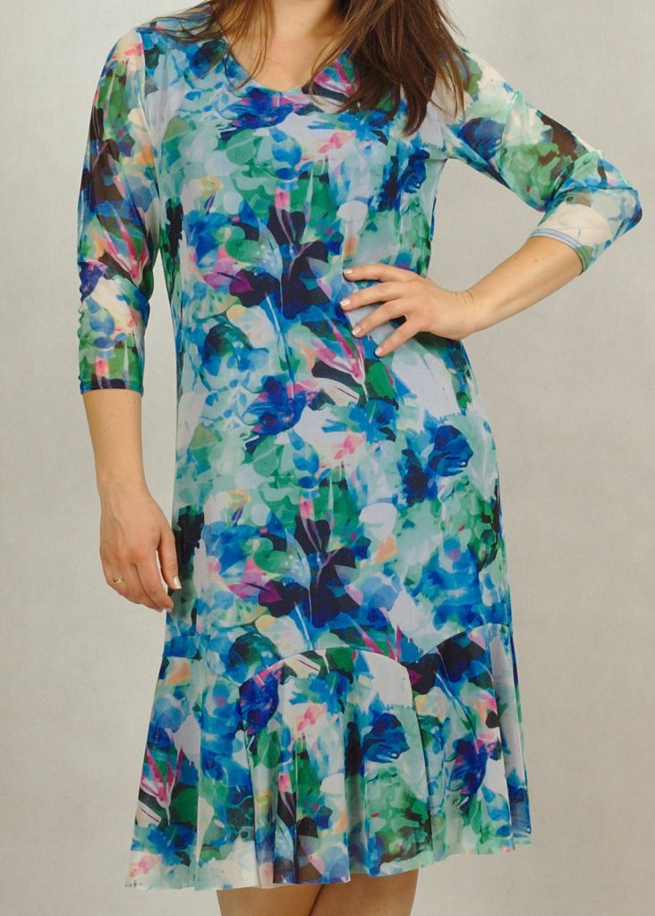 Sukienka premium wykonana jest z dwóch części: wiskozowej, wysokiej jakości podszewki (100%wiskoza) w kolorze niebieskim i bardzo eleganckiej tkaniny z siatki, wykończonej zmysłową falbanką na dole. Dekolt w serek optycznie wyszczupli sylwetkę, rękaw za łokieć przykryje subtelnie ramiona. W tym miejscu siatka jest przezroczysta.